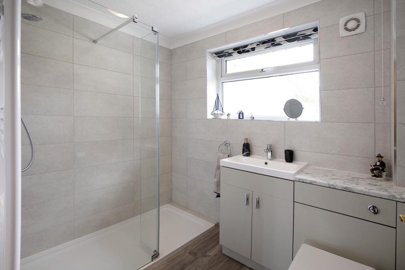FAMILY SHOWER ROOM: uPVC double glazed opaque window, shower with electric shower over and screen, wash hand basin with storage below, low level WC and radiator.