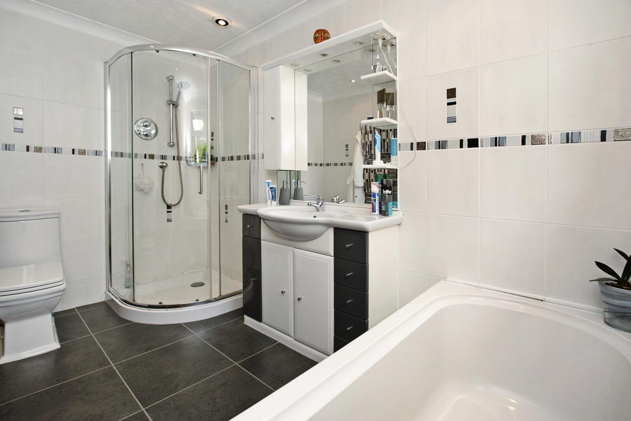 EN SUITE BATHROOM: uPVC double glazed opaque window, white suite with panelled bath, walk in curved shower cubicle, low level WC, vanity unit with cupboards, wash hand basin, shelving, mirror with lighting, light and shaver point, all in tiled surround.