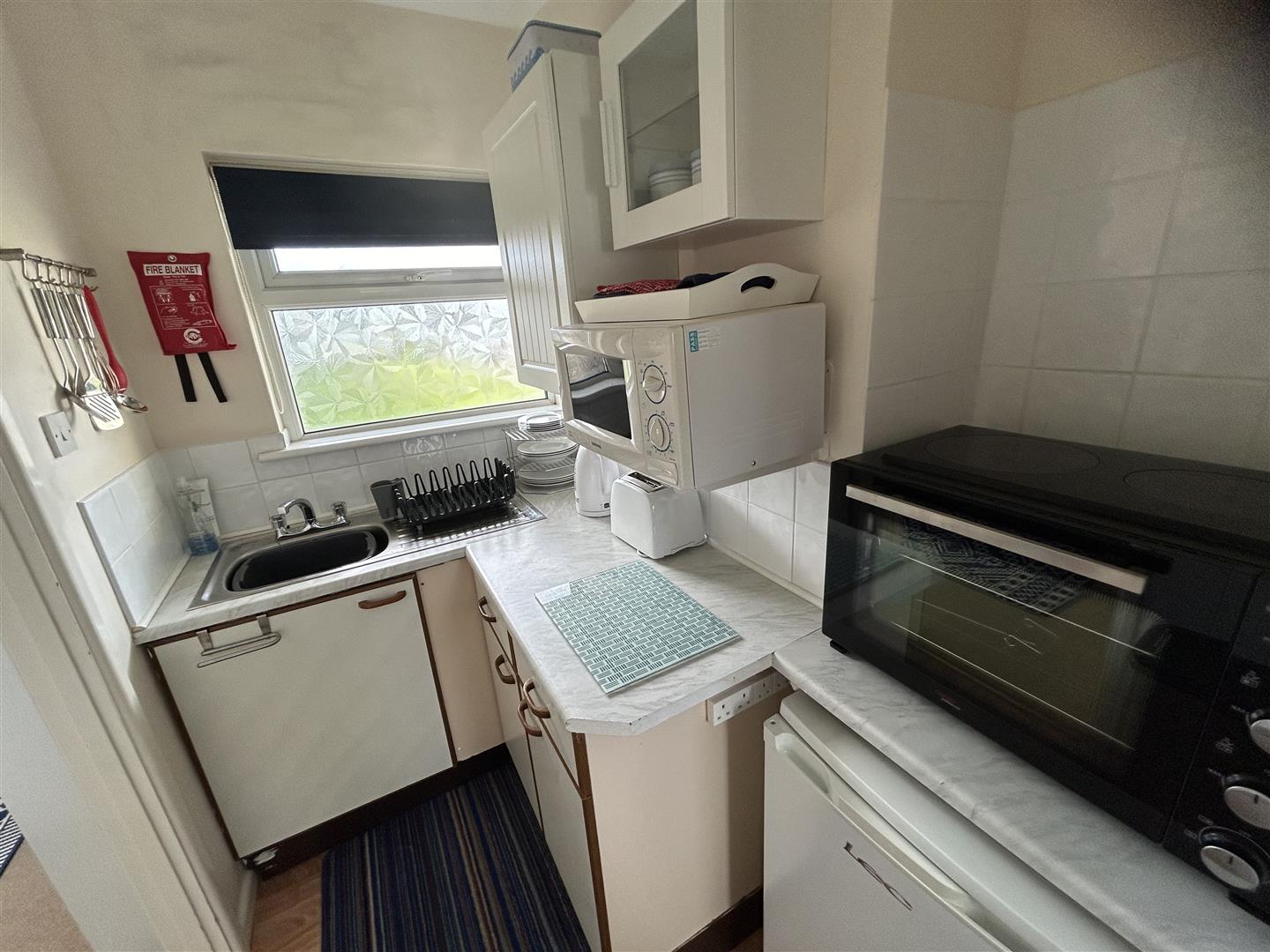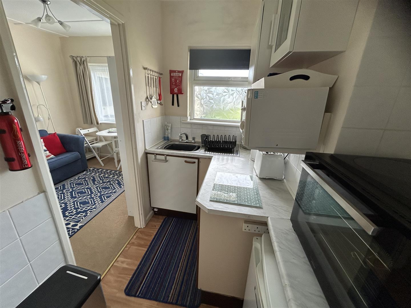 Kitchen - 2.03m x 1.30m (plus recess) (6'8" x 4'3" (plus rec - Comprising a fitted kitchen with working top surfaces incorporating a sink with drainer and mixer tap over with white tiled splashbacks (with attractive seashell feature tiles). There are a range of base units with drawers and cupboards under (one containing the water heater), space for a fridge/freezer, shelf suitable for a microwave and wall units with cupboards (one with display shelf). There is wood effect vinyl flooring, a corner unit with shelving, a spotlighting arrangement, part tiling to the walls, an obscure glazed window to the front aspect and a concertina door to