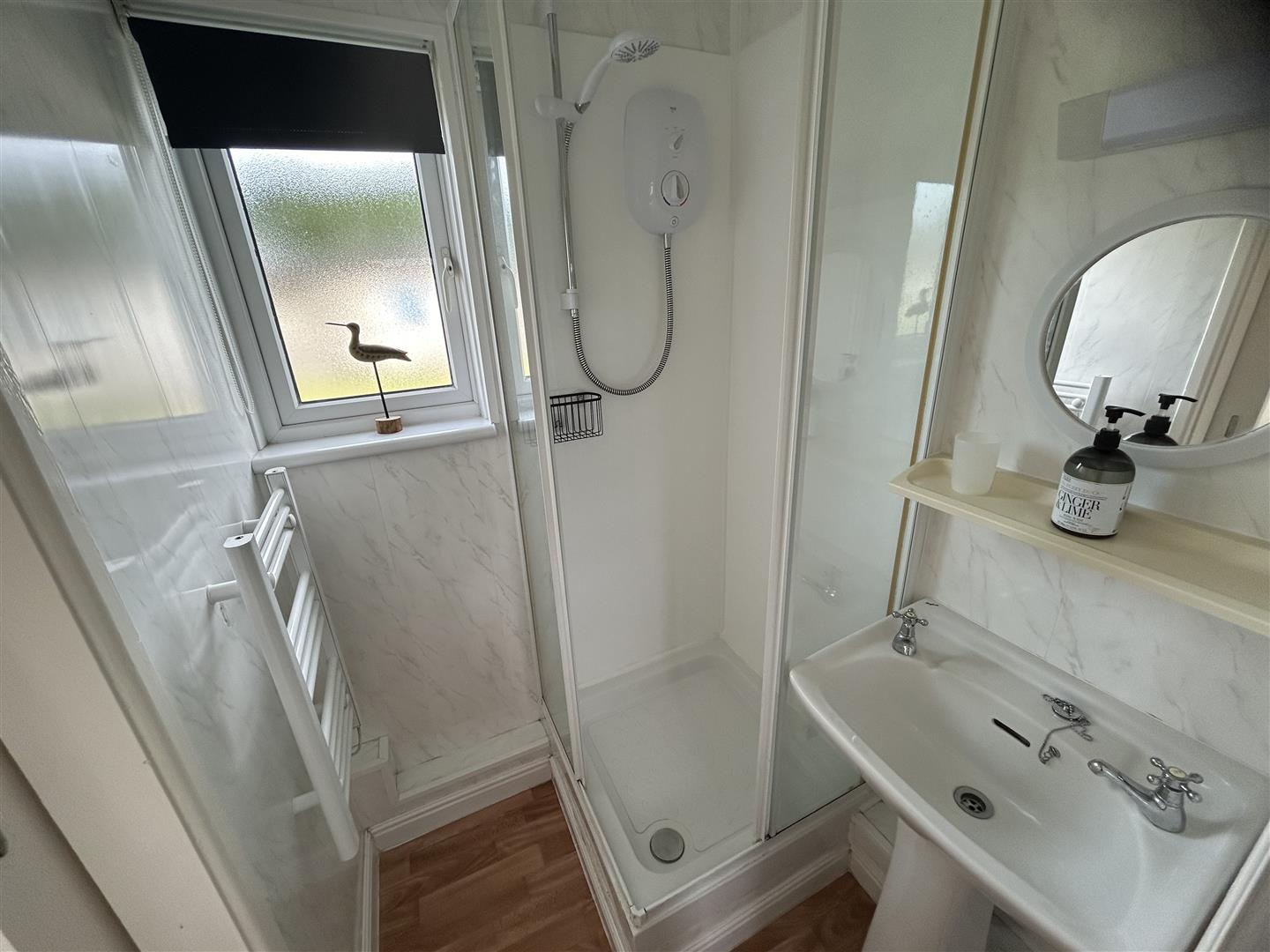 Shower Room - Comprising a walk in shower cubicle with sliding doors, a Mira electric shower, with easy clean surfaces throughout, a pedestal wash hand basin with shaver point and light, wood effect vinyl flooring, a mounted towel rail and an obscure glazed window to the rear aspect. Sliding door to
