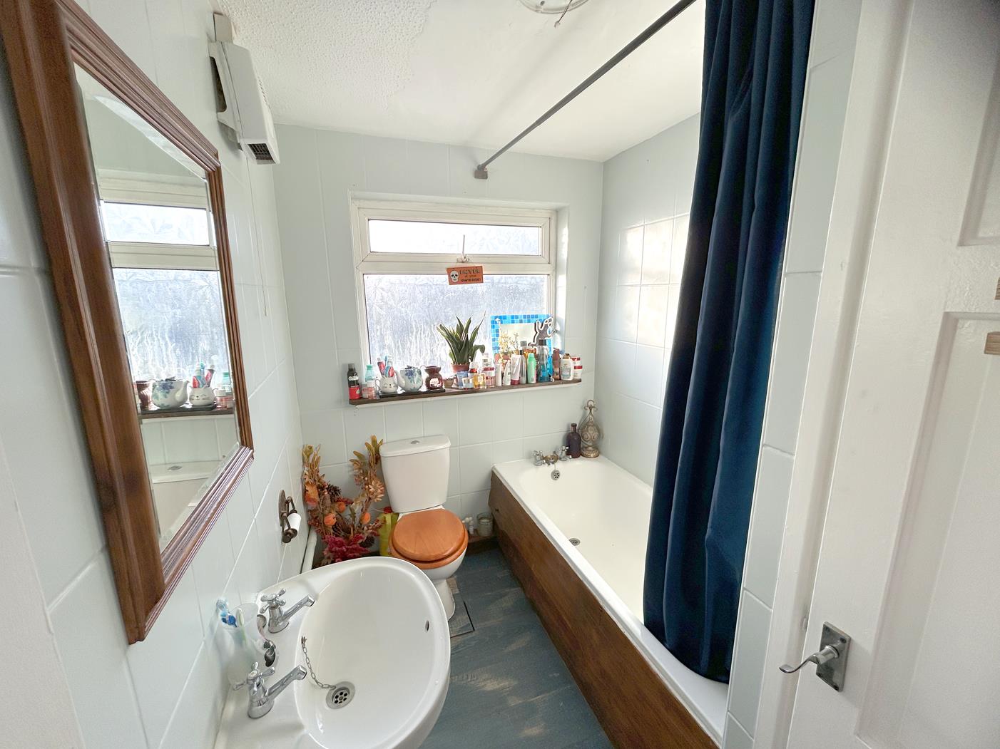 Bathroom - With white suite comprising a low level W.C., pedestal wash hand basin and a panelled bath with tiled surround, shower rail and a Mira Sport electric shower. Downflow wall heater, obscure glazed window to rear, painted wood flooring and an airing cupboard with slatted shelving housing the hot water cylinder.