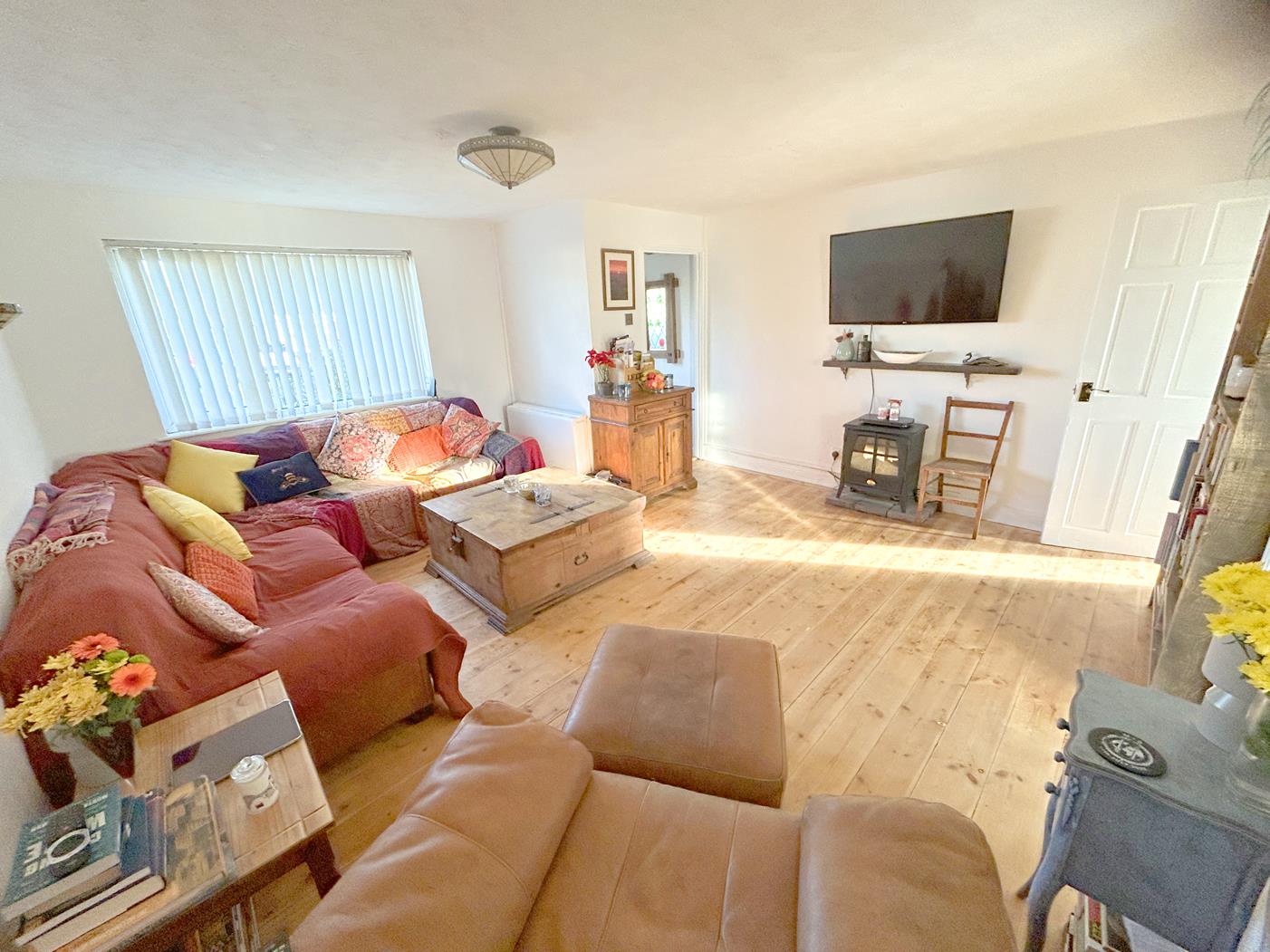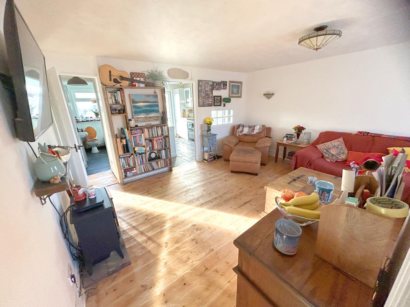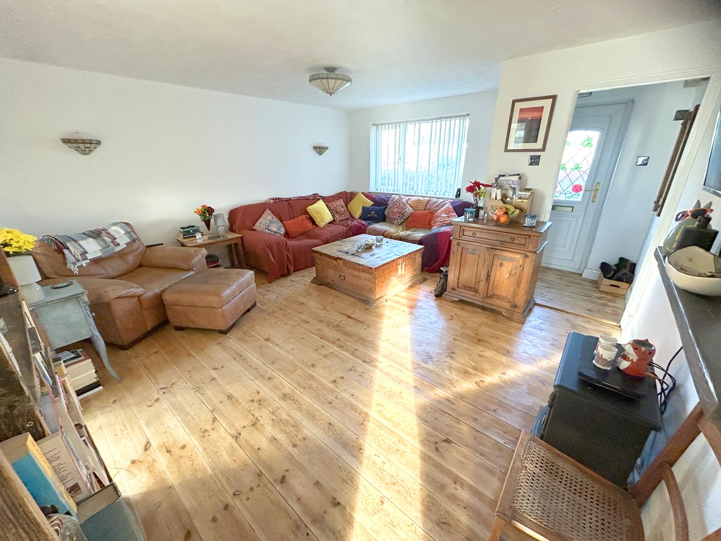 Lounge - 4.70m x 4.45m (narrowing to 3.05m) (15'5" x 14'7" - A light and spacious room with stripped wood flooring, large window to the front aspect, Creda wall mounted electric storage heater, glazed feature block panel to kitchen, wall lights, door to inner hallway and an opening to