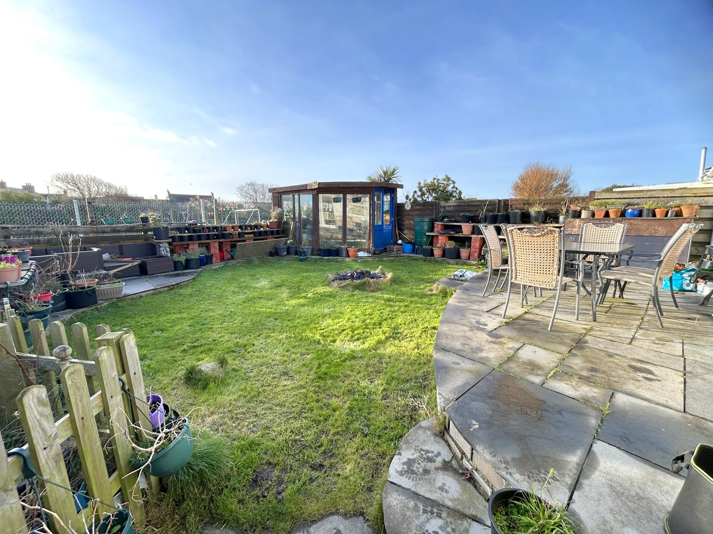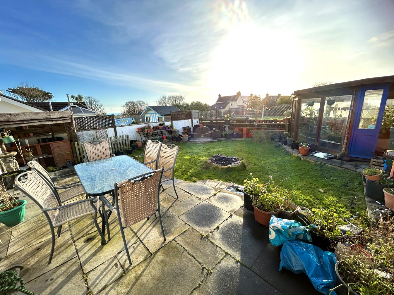 Rear Garden - Enjoying a sunny outlook, sea glimpses and being partly laid to lawn with established shrubs and areas of patio on which to sit out and relax. The rear garden is neatly enclosed with a large greenhouse that has electric and water, whilst there is an open covered area with a compost bin and a service door to the garage.