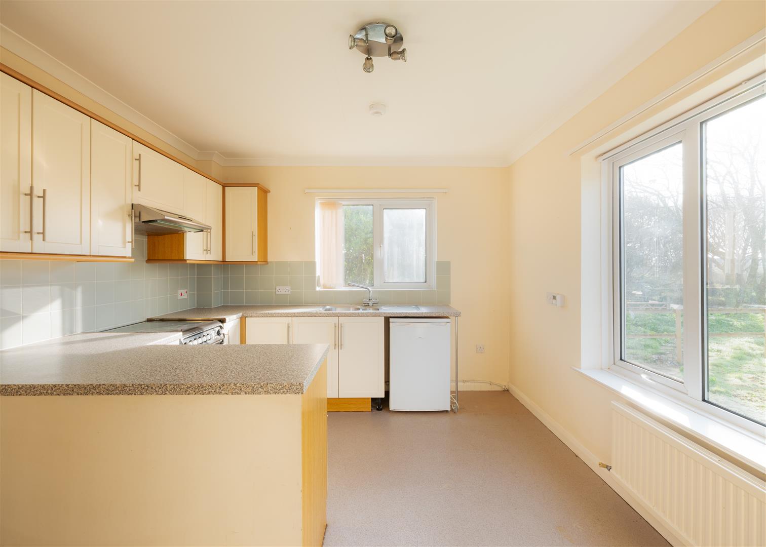 Kitchen/Breakfast Room - 4.10 x 3.15 (13'5" x 10'4") - A dual aspect room with windows to the front and side having a cream fitted kitchen with stone effect worktops that incorporate a one and a half bowl stainless steel sink drainer unit, there are a mix of base and drawer units under, wall units over, spaces are provided for a cooker and fridge freezer, the room is lit by a spotlight arrangement and also houses the Worcester oil boiler, door back to inner hallway and to -