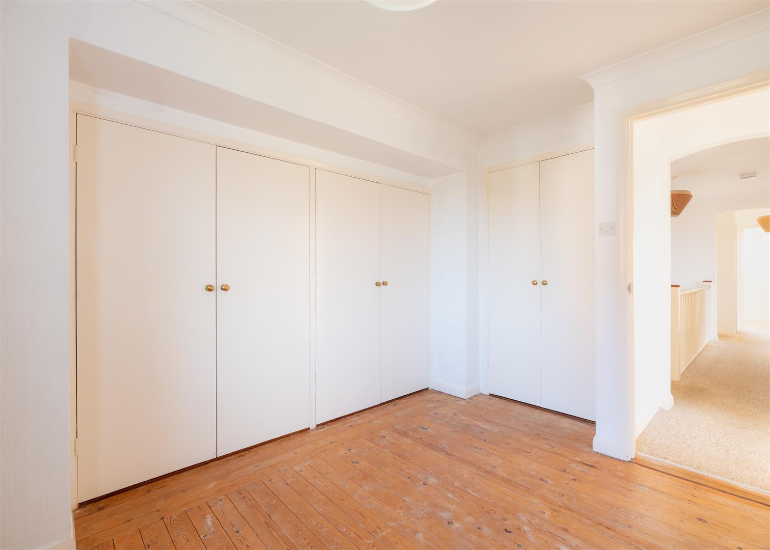 Landing - With loft hatch to roof space, cupboard with slatted shelves housing the immersion heater and a further door leads into an eaves storage area. Doors to -