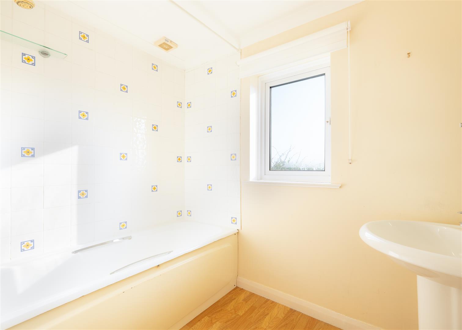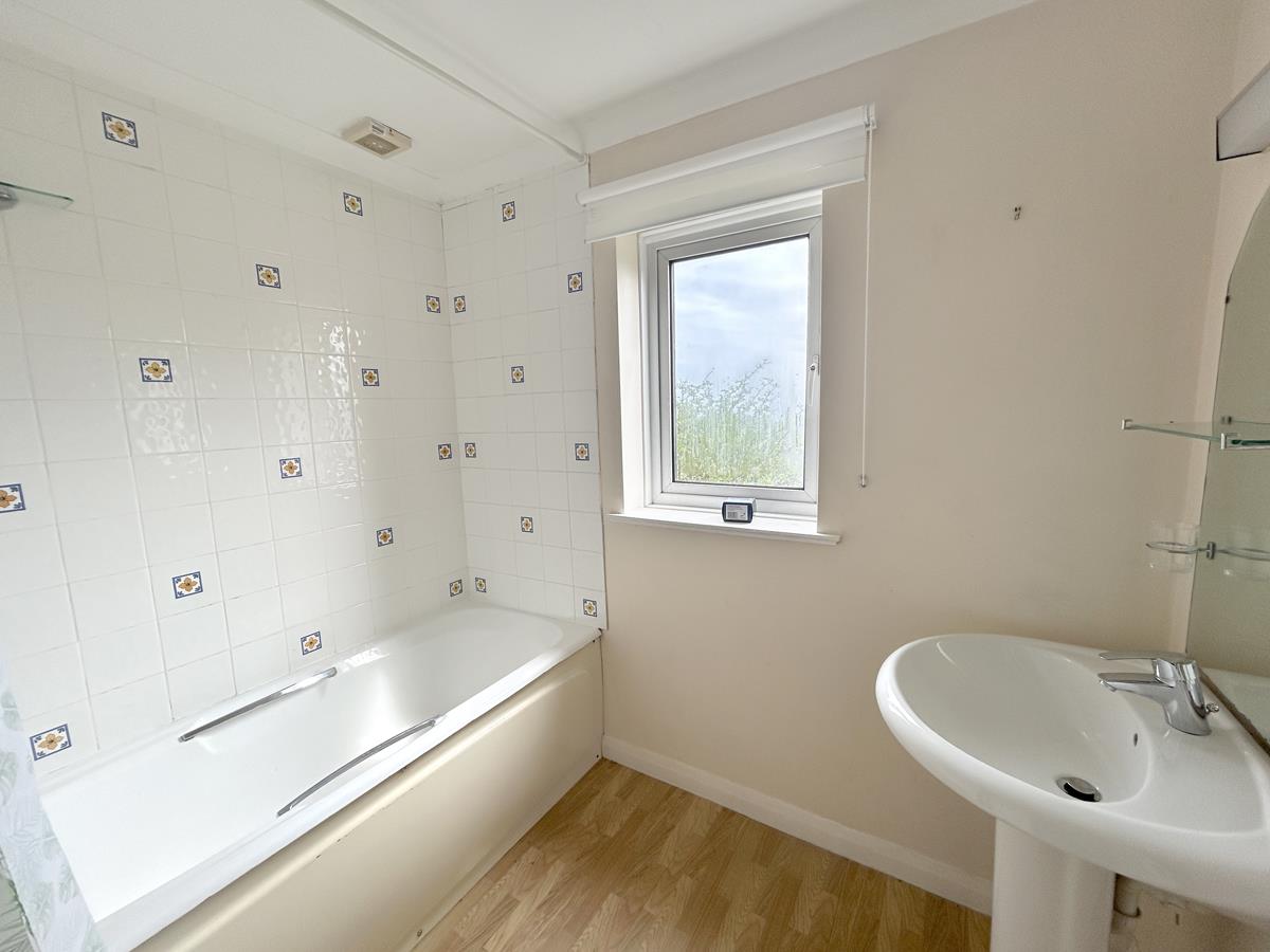 Bathroom - With suite that comprises of a panelled bath with tiled splashback and electric shower over, wash hand basin with mirror and shelf over, shaver socket and light, wood effect laminate flooring, window to the side aspect that looks over the top of Landewednack Church and out to sea with the coast in the distance.
