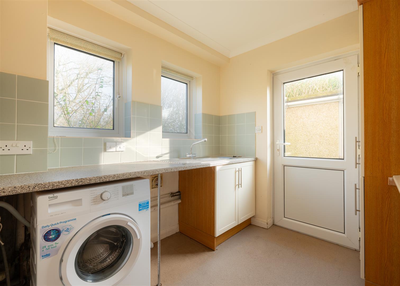Entrance Area/Utility - 2.36 x 2.26 (7'8" x 7'4") - With worktops with cupboards under and tiled splashbacks incorporating a stainless steel sink drainer, plumbing for washing machine, coat hanging space and two windows to the rear aspect overlooking the garden with door to -