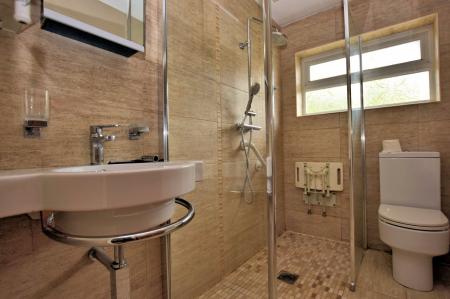 SHOWER ROOM Three piece suite comprising a low level WC, wall hung washbasin with mixer tap over, walk-in shower, tiled splashbacks, tiled flooring, radiator and double glazed window to rear with extractor fan.