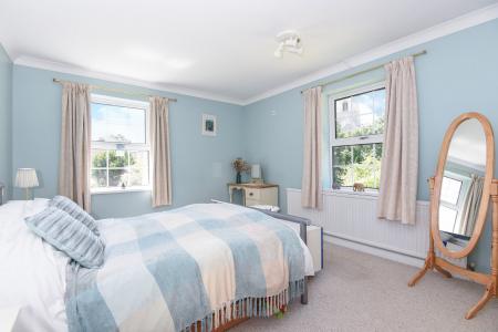 BEDROOM THREE 12' 10" x 10' 11" (3.91m x 3.33m) Double glazed windows to front and side with lovely views, fitted wardrobes, carpeted flooring, radiator and television point.