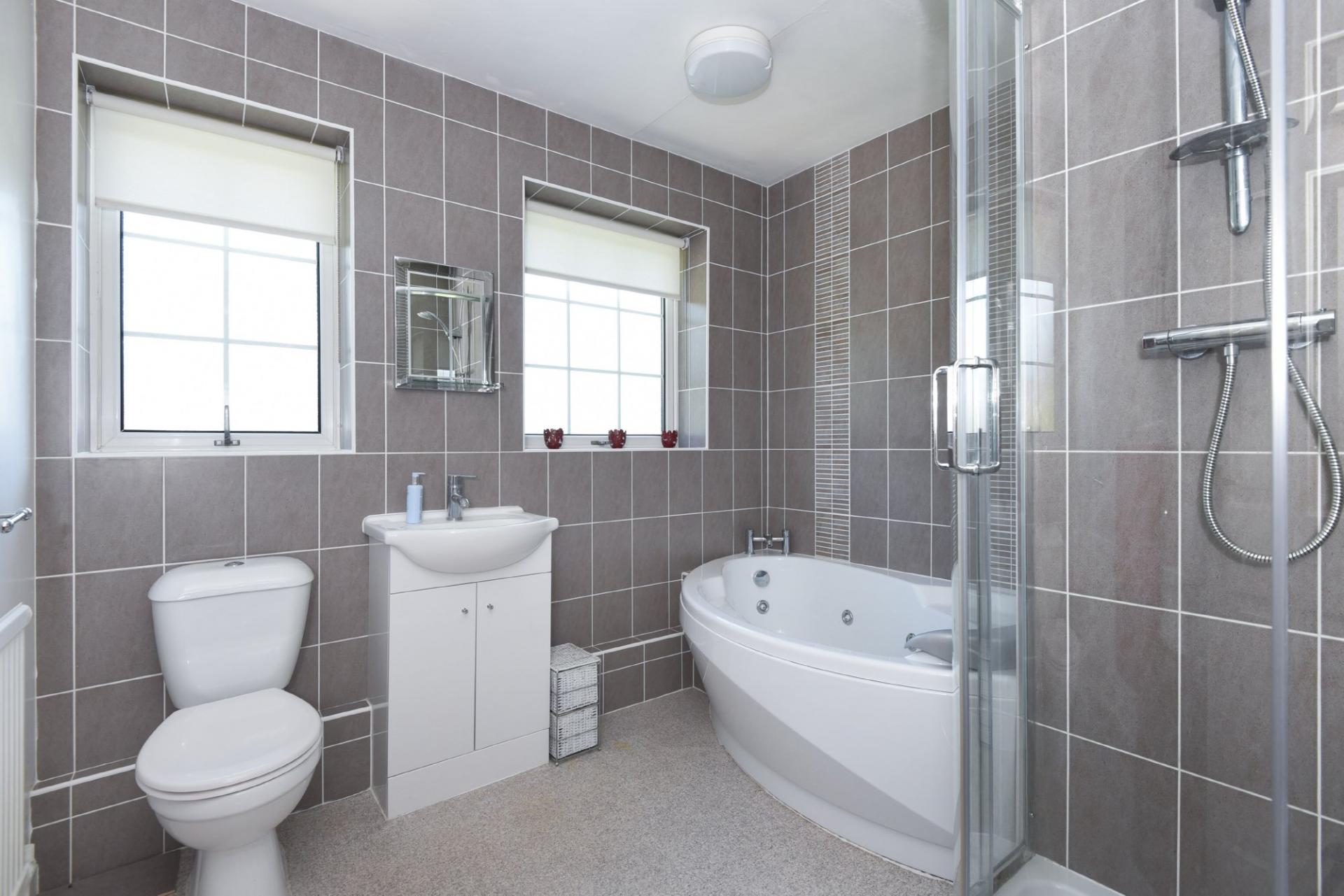 FAMILY BATHROOM Modern four piece suite comprising of a corner bath with Jacuzzi waterjets, walk-in shower cubicle, washbasin mounted on a vanity unit and low level WC. Double glazed window to side with frosted glass, tiled walls, vinyl flooring and radiator.
