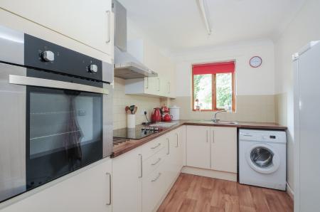 KITCHEN 10' 4" x 6' 10" (3.15m x 2.08m) Fitted with a range of wall and base units in a modern cream finish with walnut effect worktops, electric hob with stainless steel extractor fan above and electric eye level oven. Stainless steel sink, washing machine, wood effect vinyl flooring, window to side and tiled splashbacks.