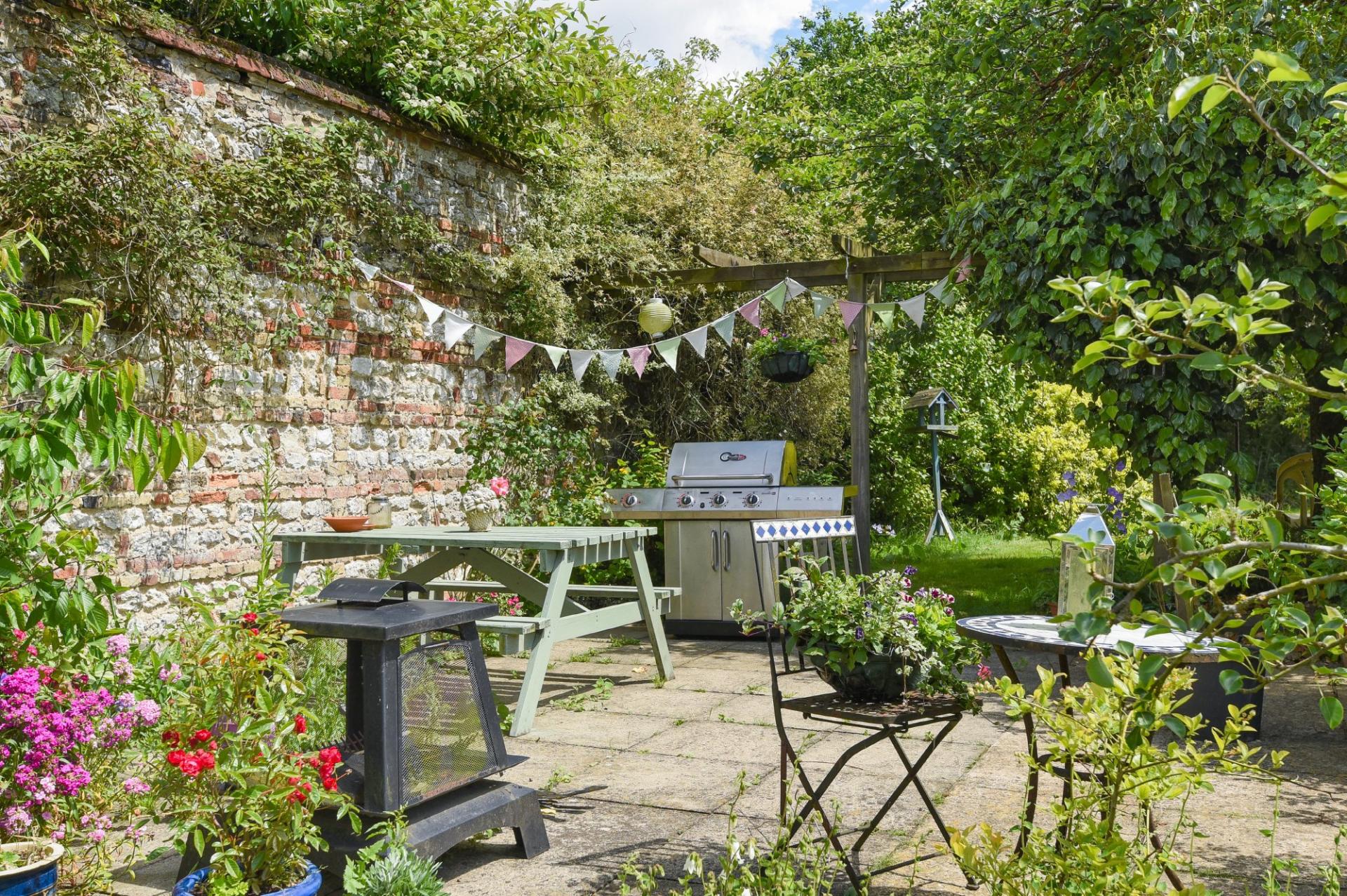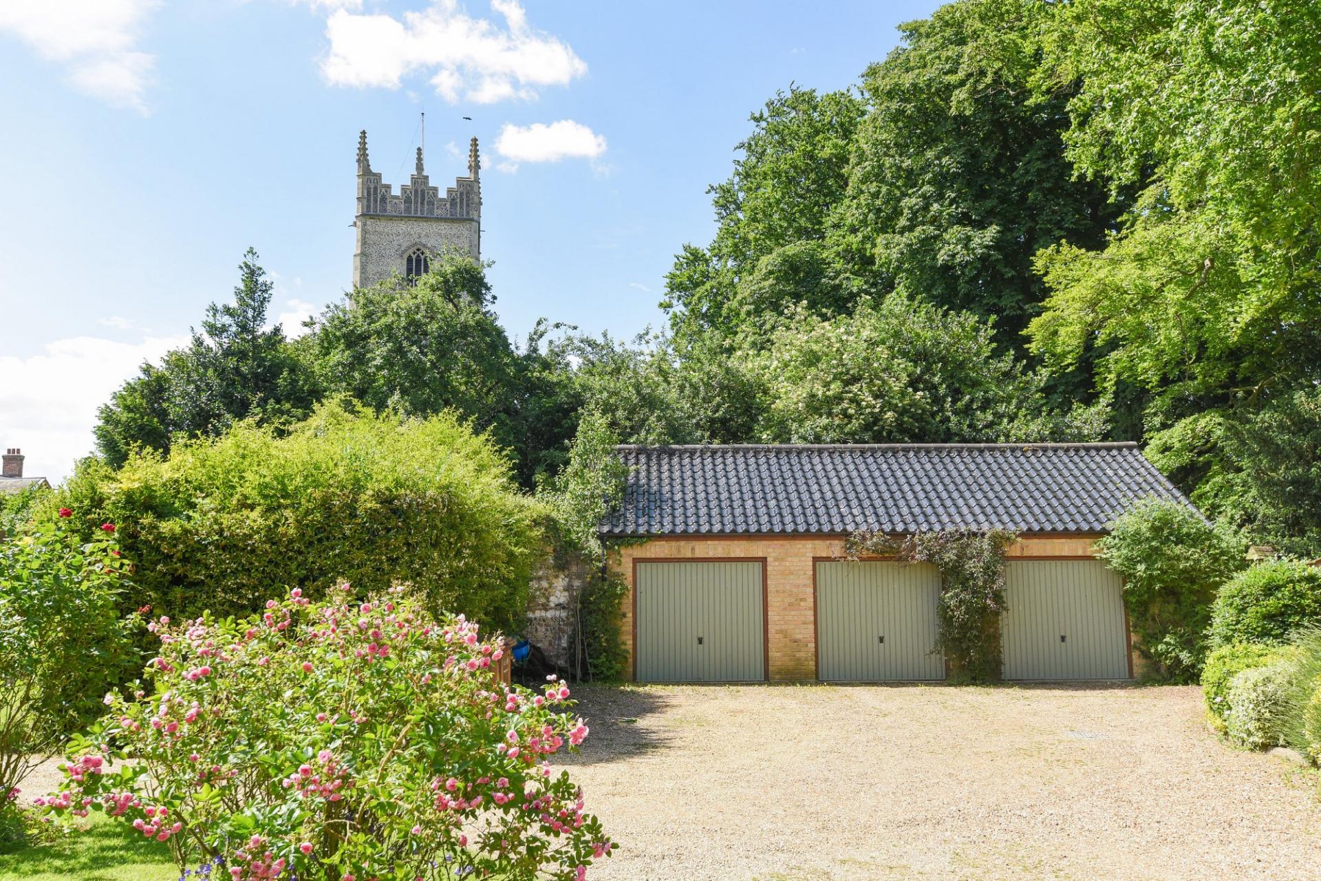 OUTSIDE The property sits fairly central to its plot with fully walled gardens wrapping around three sides and with views to the church to one side. The property is approached through wrought-iron gates onto the shingle parking area in front of the main house and annexe and in turn leads up to the triple garage to the side. There is parking for numerous vehicles. There are lawns laid to a variety of areas including a courtyard garden to the rear, garden to the front as well as main lawns to the front and side. The mature plot features an abundance of trees, plants and flowers of many varieties. There is a small orchard area bordered by soft fruit bushes and also a separate productive soft fruit/vegetable garden. Also within the gardens are a number of seating areas around the garden with a patio to the south side, making the most of the sun during the day.