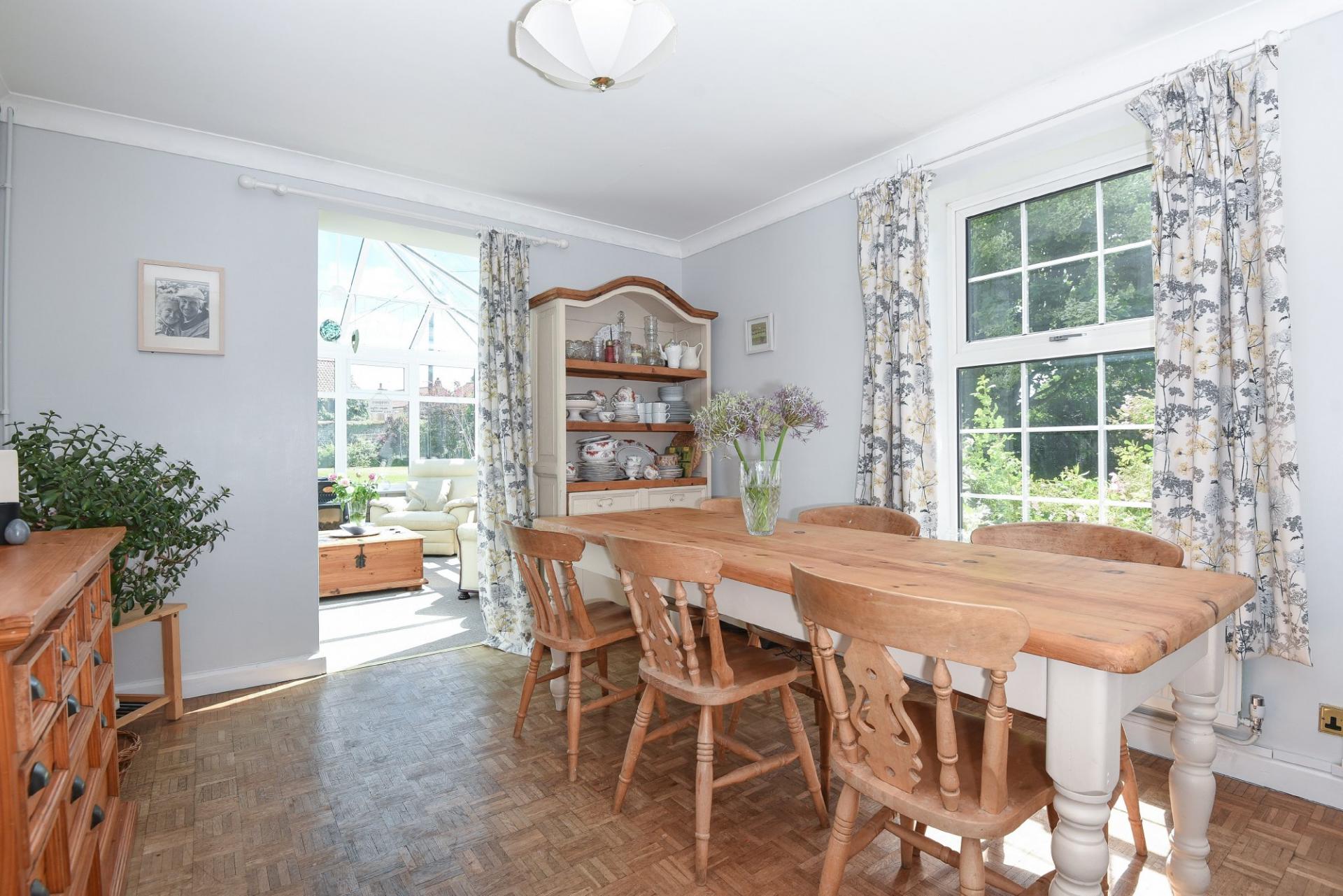 DINING ROOM 12' 10" x 10' 11" (3.91m x 3.33m) Double glazed window to front, parquet wooden flooring, radiator, wall lighting and opening to conservatory.