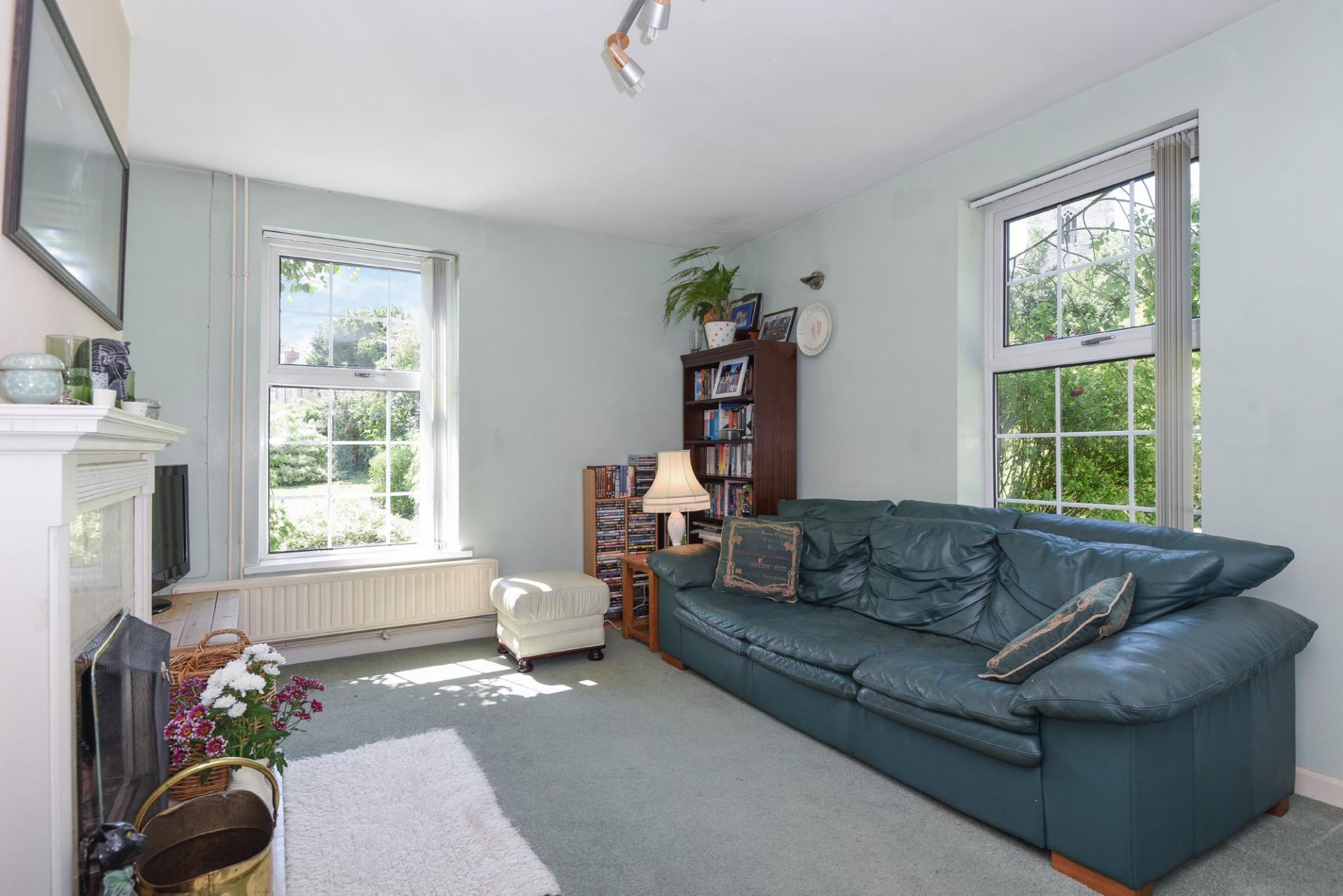 RECEPTION ROOM TWO 15' 6" x 11' 5" (4.72m x 3.48m) Triple aspect with double glazed windows to front, side and rear, carpeted flooring, television point, wall lighting, radiators and fireplace with open fire.