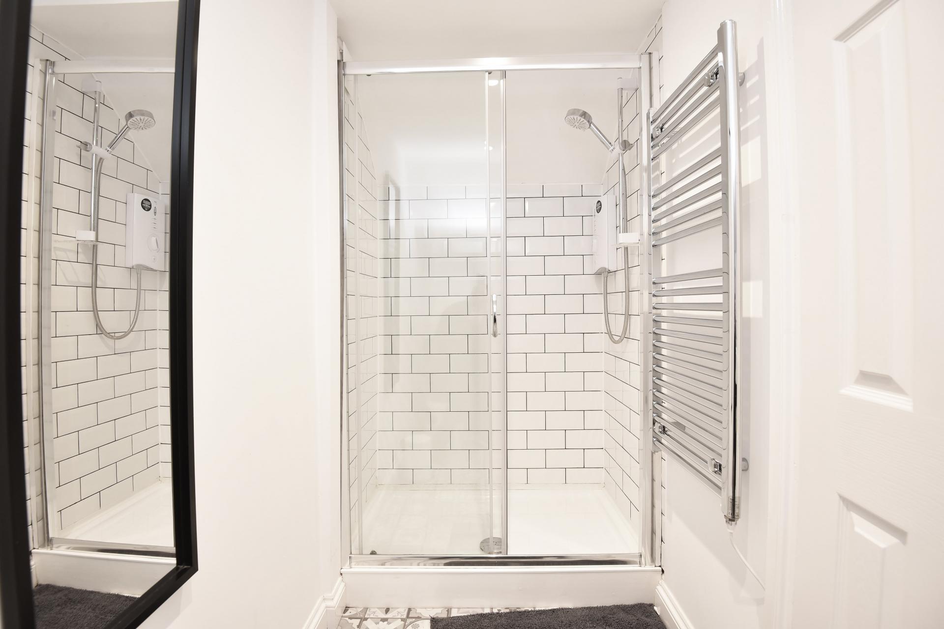A modern white suite comprising WC, washbasin set with a vanity unit, and shower. Heated towel rail.