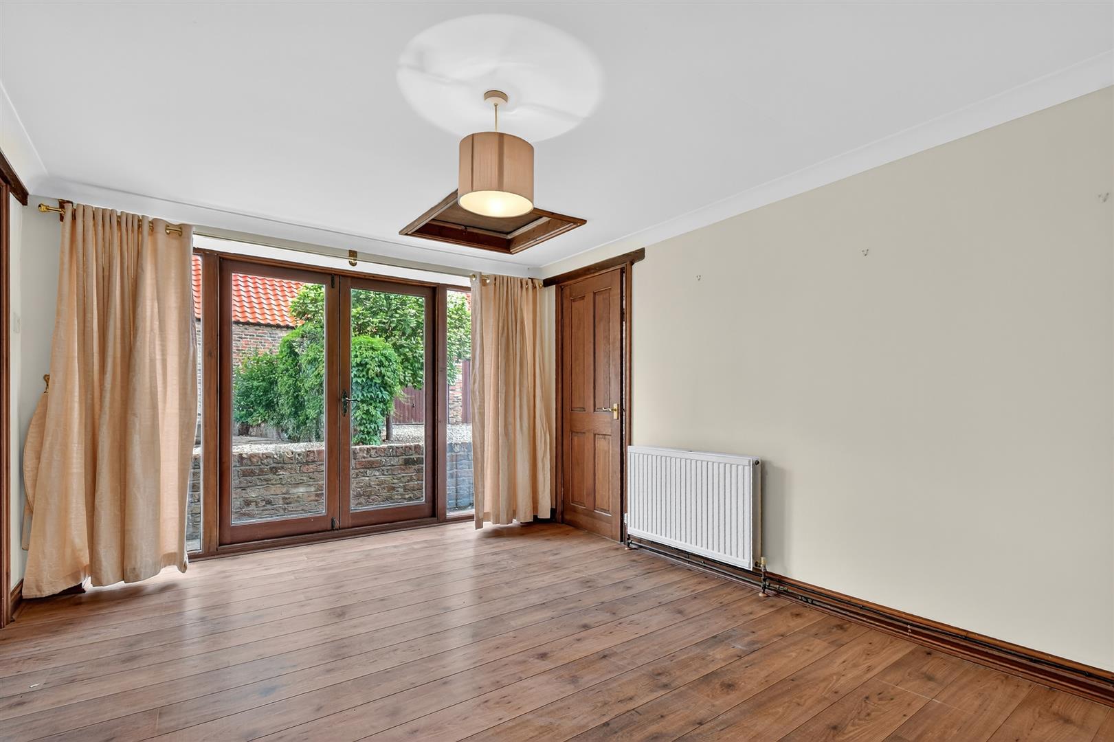 SITTING ROOM extends to over 23ft in length and enjoys a dual aspect outlook the front and side. To one side there is a feature cast multi fuel burning stove with tiled hearth and solid oak surround flanked by a shelved recess and double French doors leading out to a courtyard.
