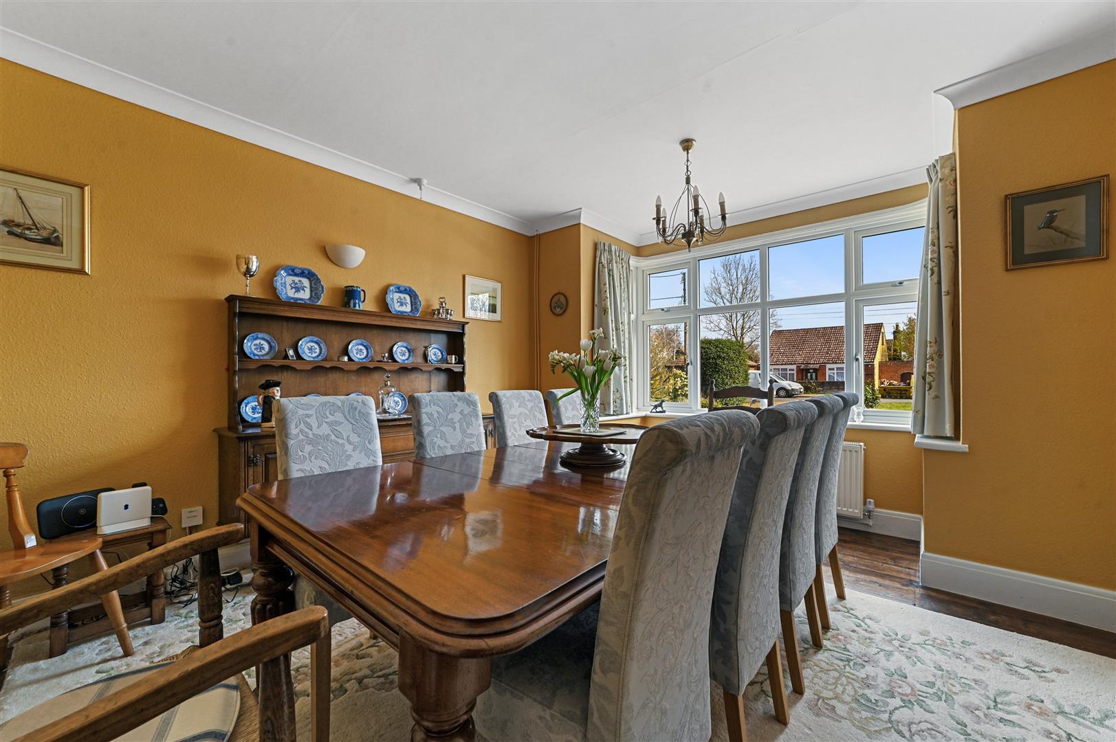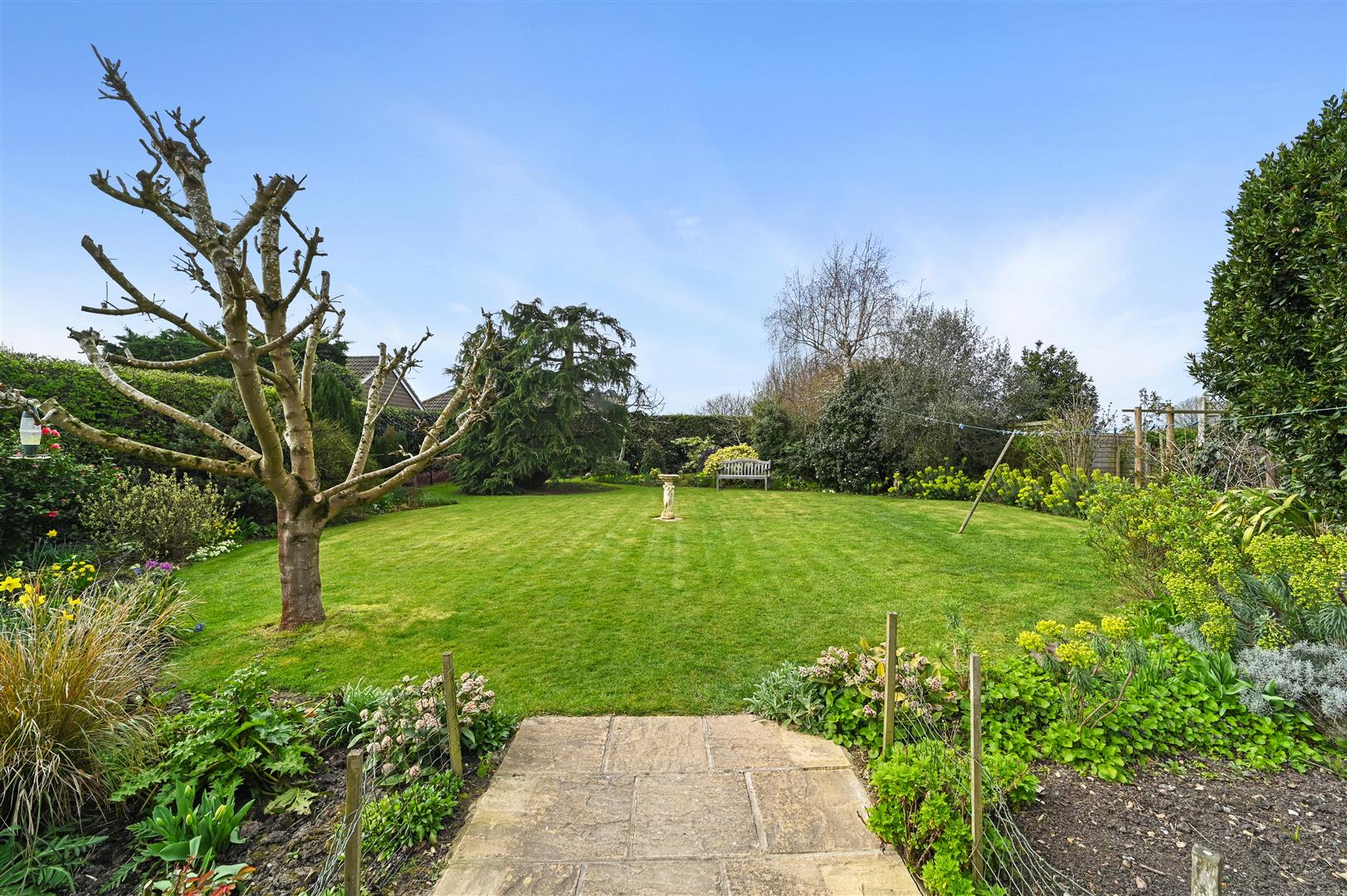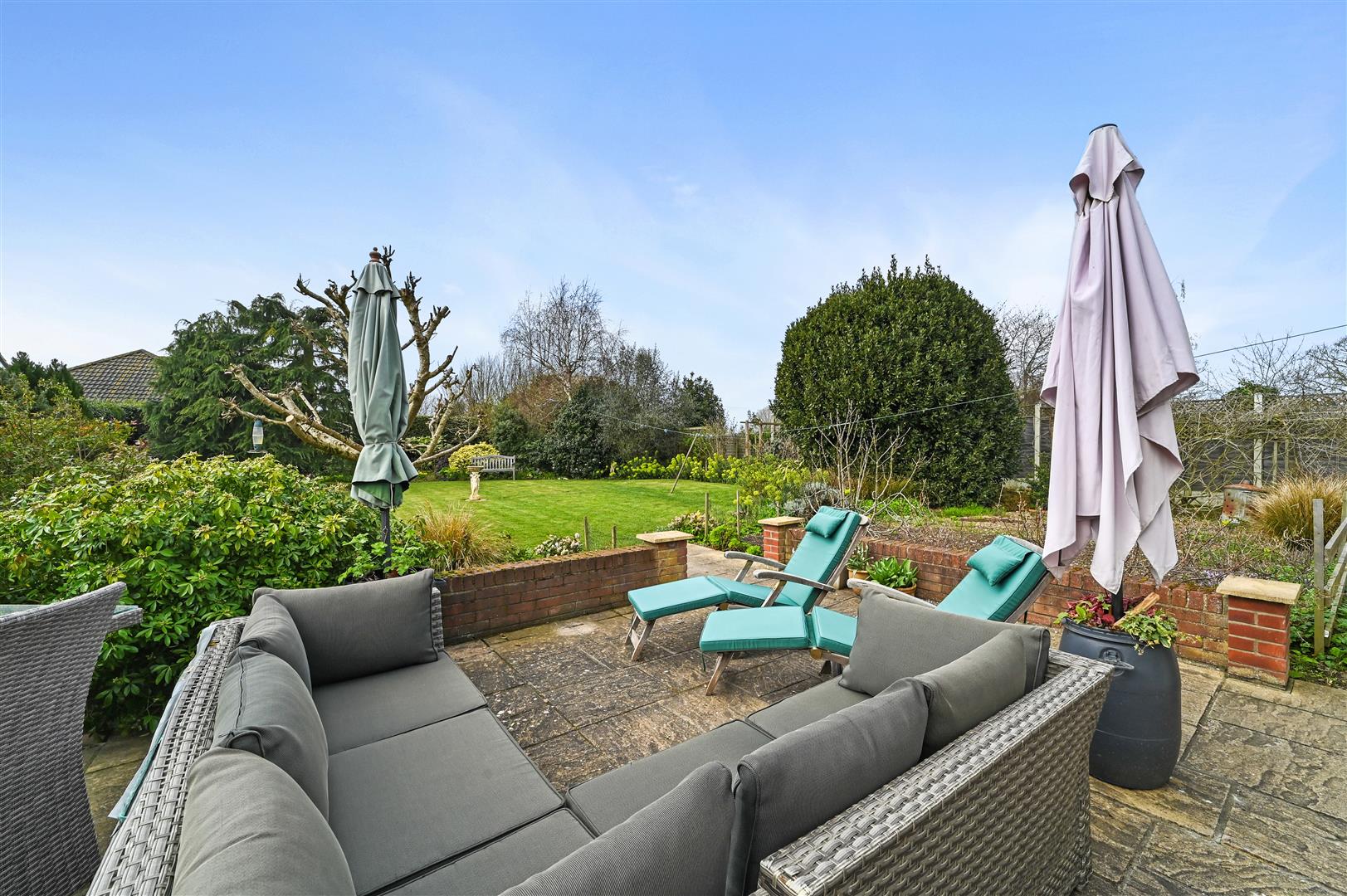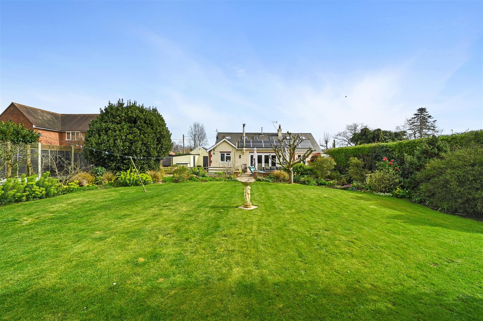 The property occupies an impressive plot approaching a third of an acre, with established gardens featuring mature shrubs, a vegetable patch, and a generous patio area, perfect for outdoor dining and entertaining.