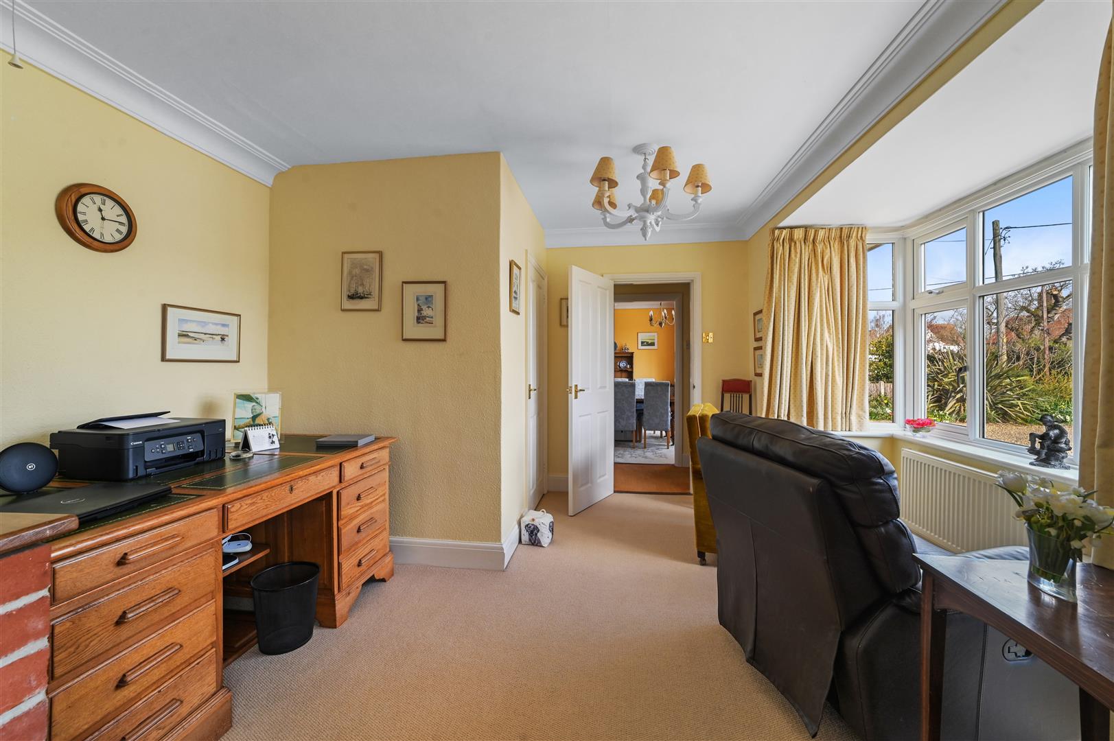The accommodation is both spacious and flexible. A welcoming entrance hallway leads to two well proportioned ground floor double bedrooms, one of which is currently utilised as a formal dining room. The L-shaped sitting room is a real focal point, featuring a bay window and open fireplace, with French doors opening onto the garden, as well as separate French doors providing access into a bright conservatory.