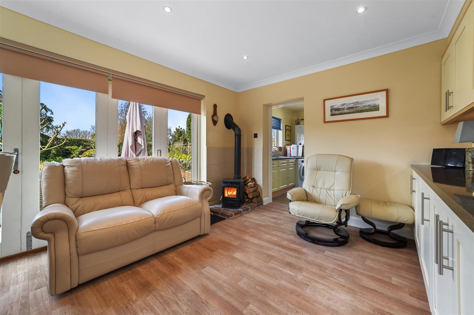 The kitchen/breakfast room is thoughtfully designed with a range of fitted units, integrated appliances, bi-fold doors to the garden, and a charming log burner, creating a warm and sociable heart of the home. A separate utility room and a well appointed bathroom complete the ground floor.
