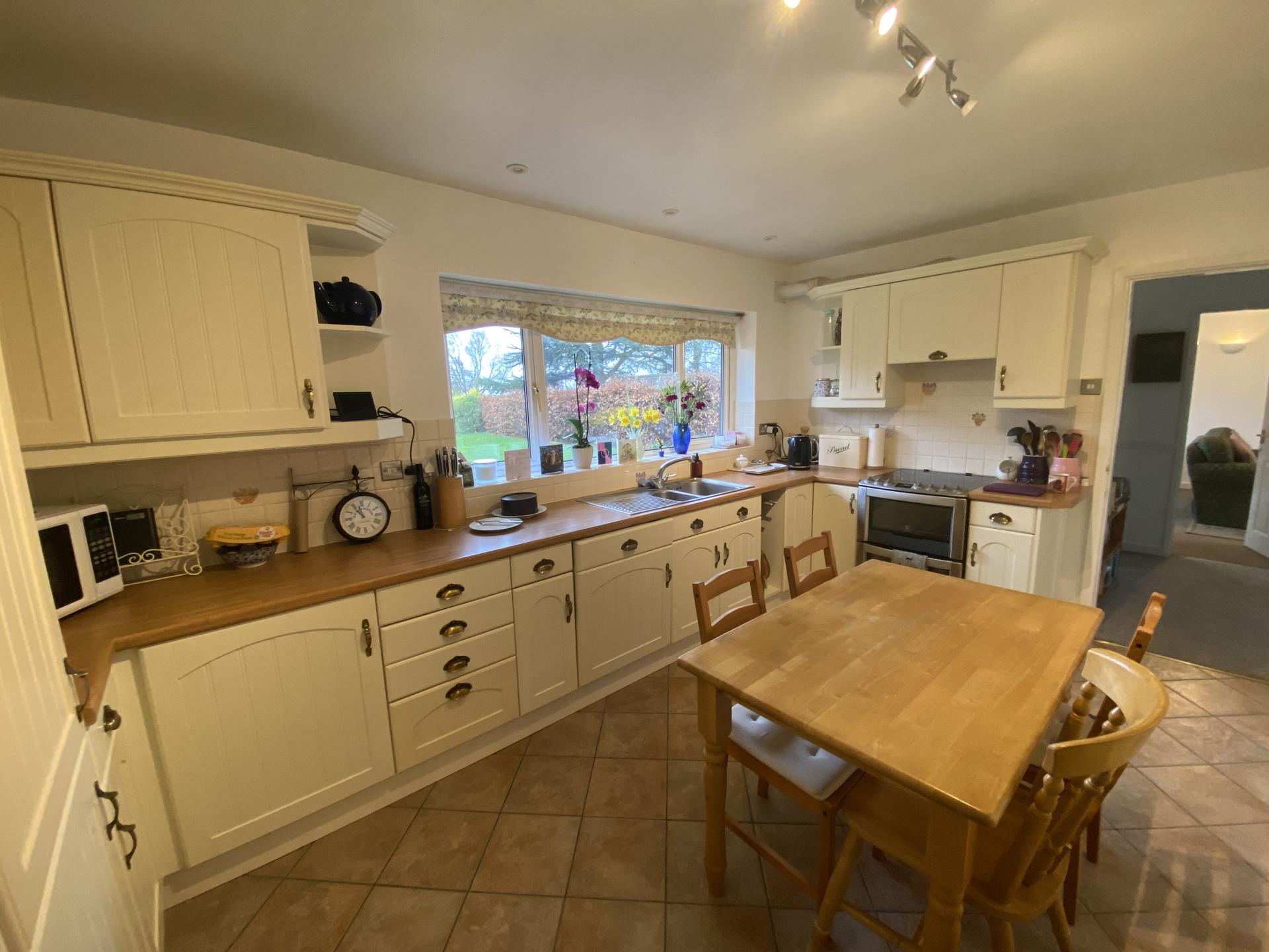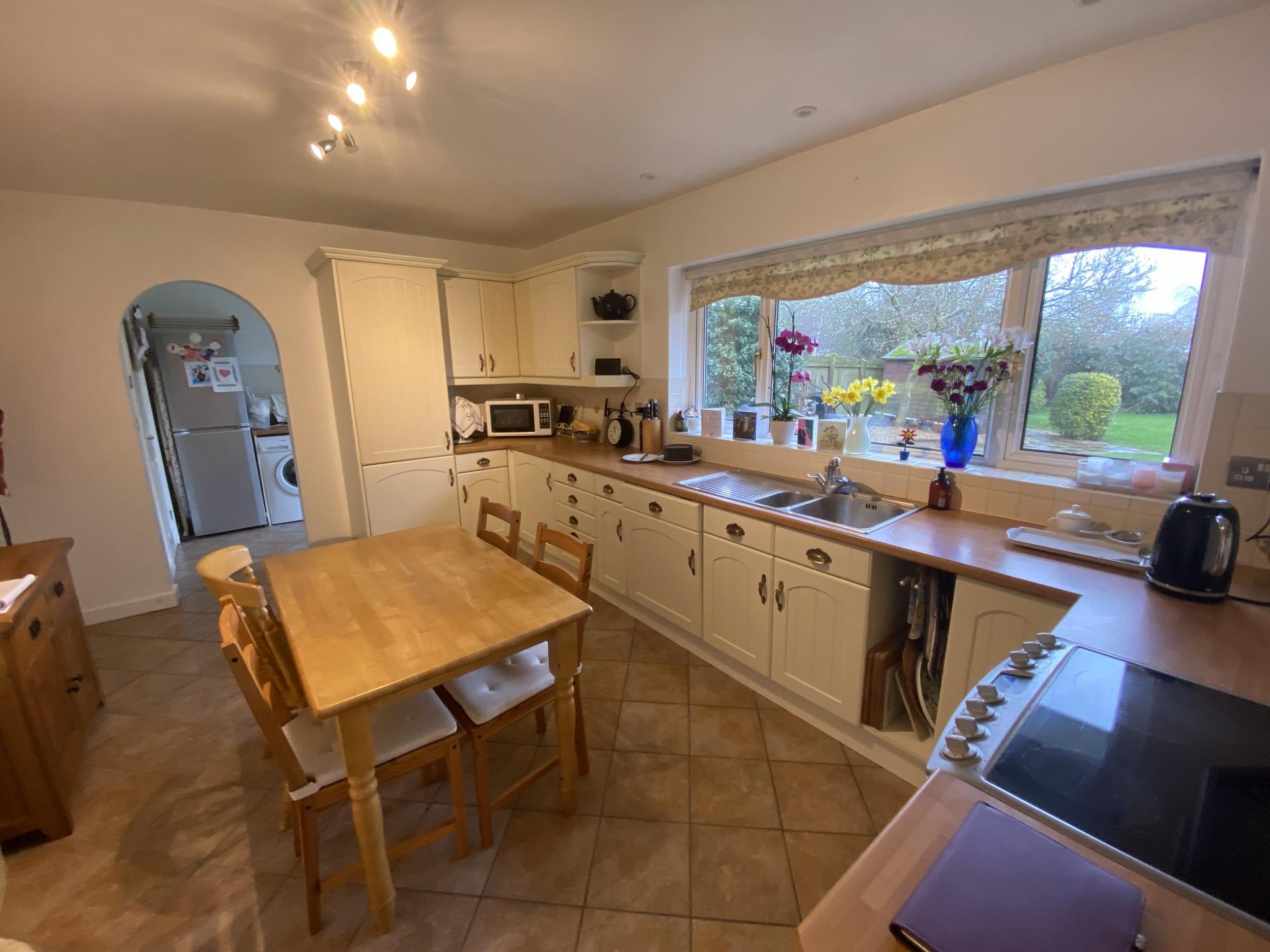 KITCHEN 15' 3" x 11' 0" (4.67m x 3.36m) UPVC window to the rear overlooking the garden, tiled floor, multiple adjustable ceiling spotlight fitment, recessed ceiling lights, radiator, shaker style units comprising base cupboards and drawers beneath the roll edge worktops with inset one and a quarter bowl single drainer, stainless steel sink unit with mixer tap, integrated dishwasher, intermediate wall tiles, eye level wall cupboards, personnel door to garage, arch to
