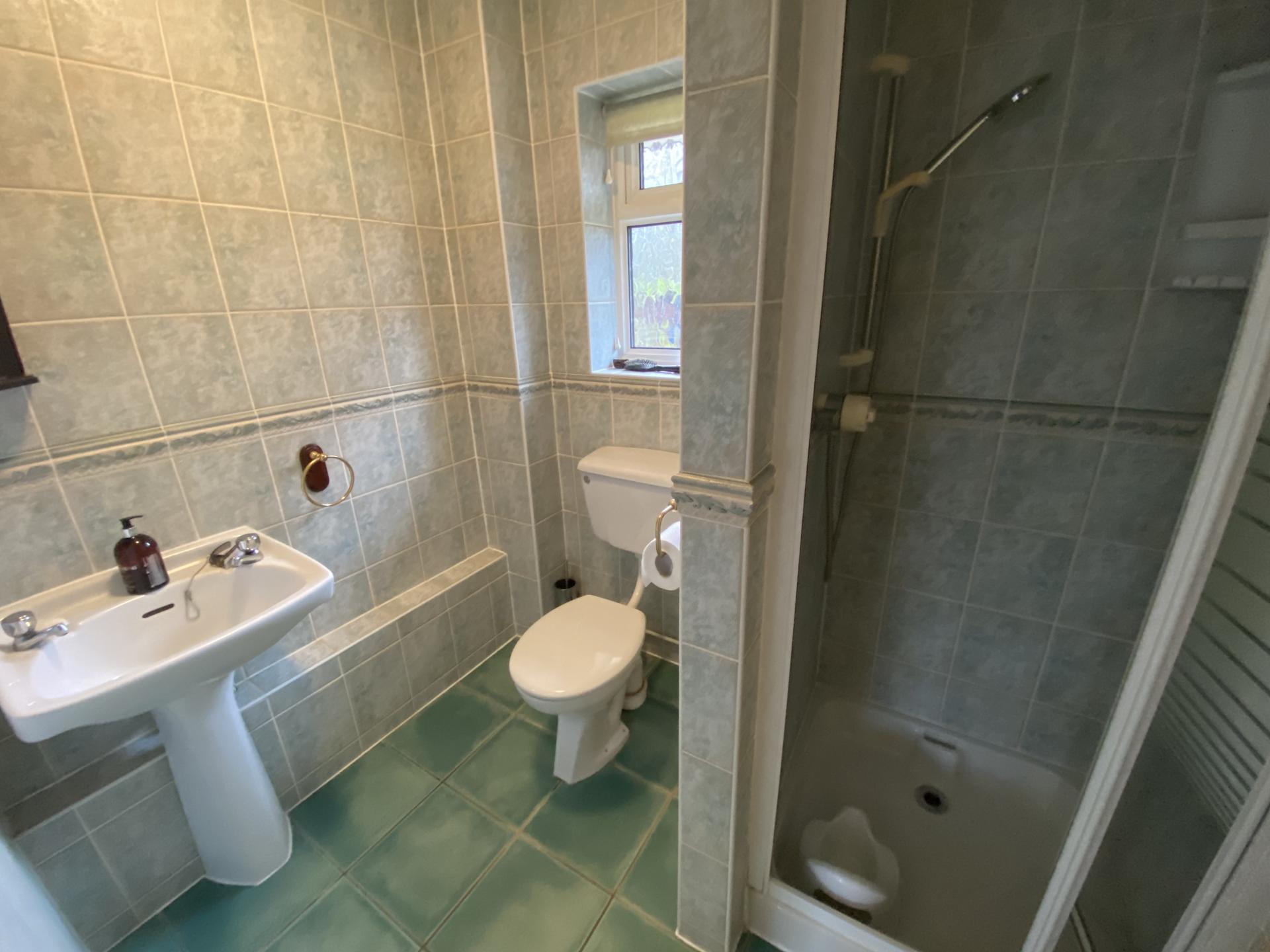 SHOWER ROOM 6' 10" x 5' 4" (2.10m x 1.63m) Fully tiled walls, 3 piece suite comprising shower with fitted Mira shower, pedestal wash hand basin and low level WC, tiled floor, ceiling light, extractor fan, obscure glazed UPVC window, radiator