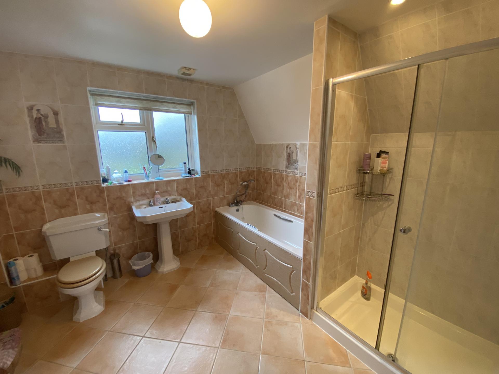 ENSUITE 10' 2" x 10' 4" (3.11m x 3.15m) Four piece suite comprising panel bath with mixer tap, shower attachment and hand grips, pedestal wash hand basin, low level WC, large walk in shower with Mira shower, fully tiled walls, tiled floor, radiator, ceiling light, extractor fan, shaver point with courtesy light