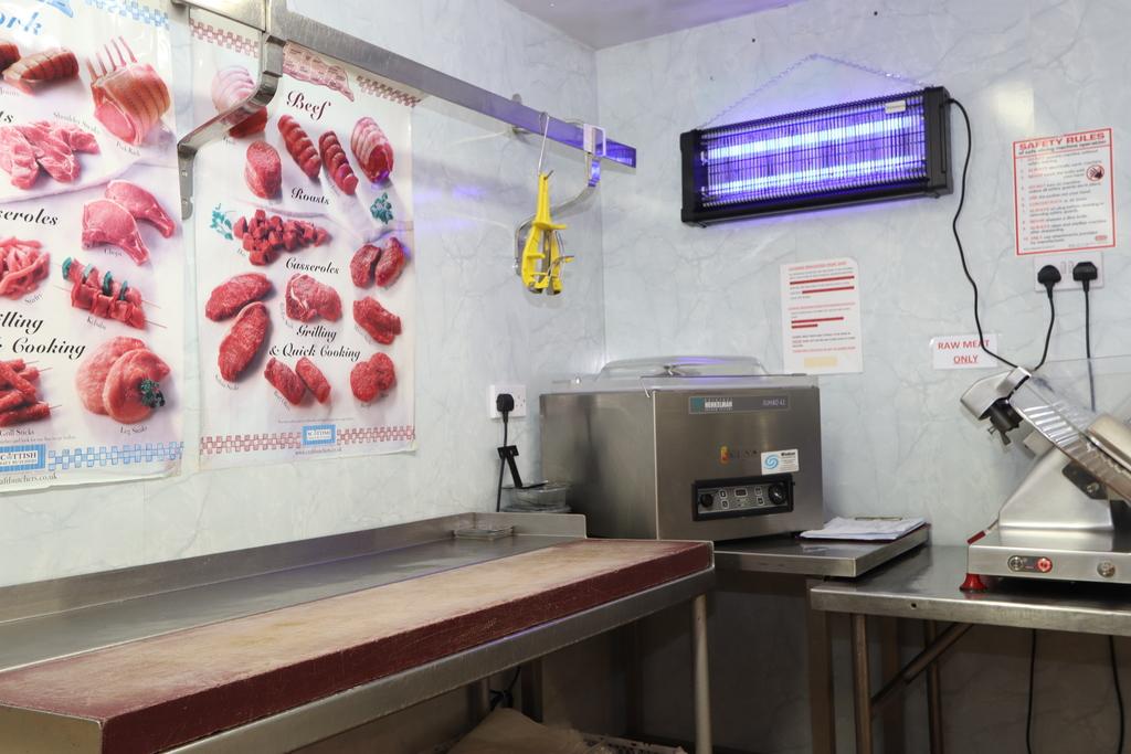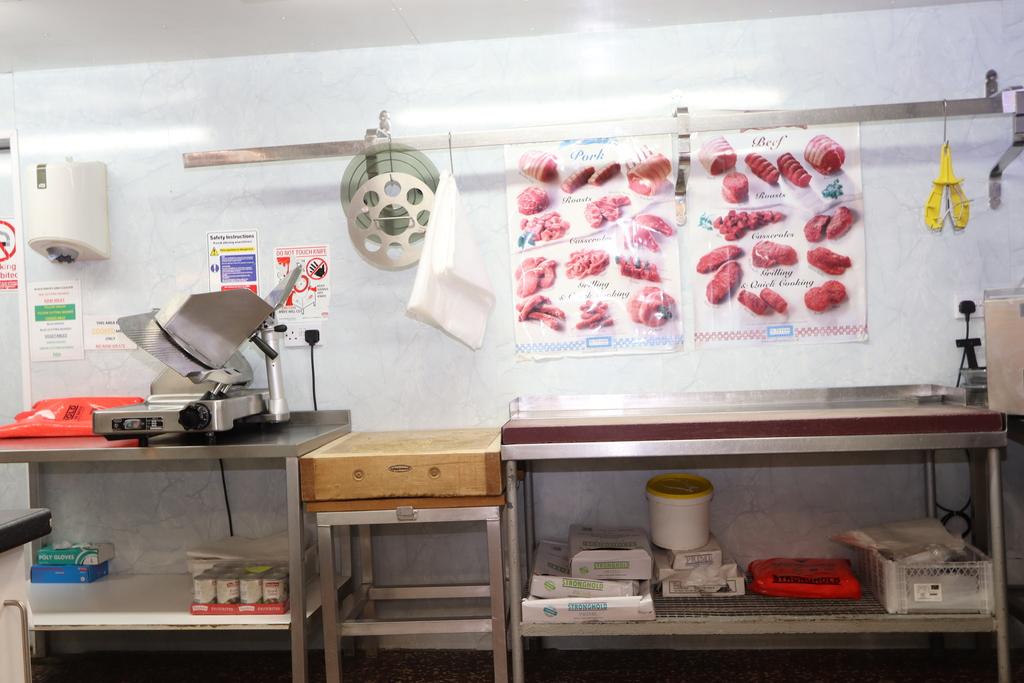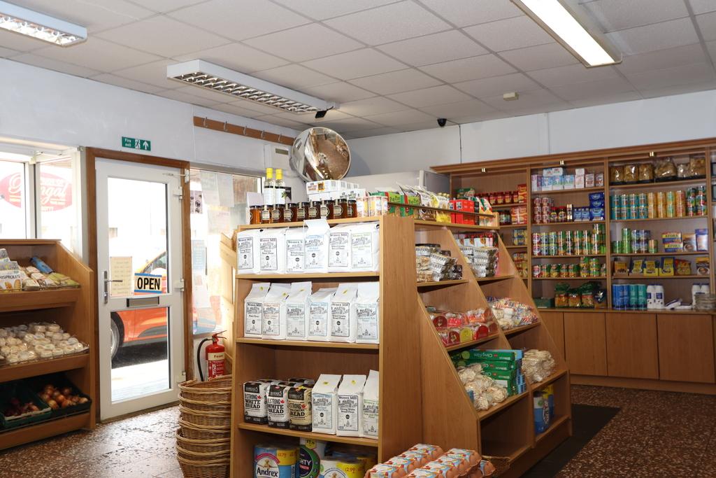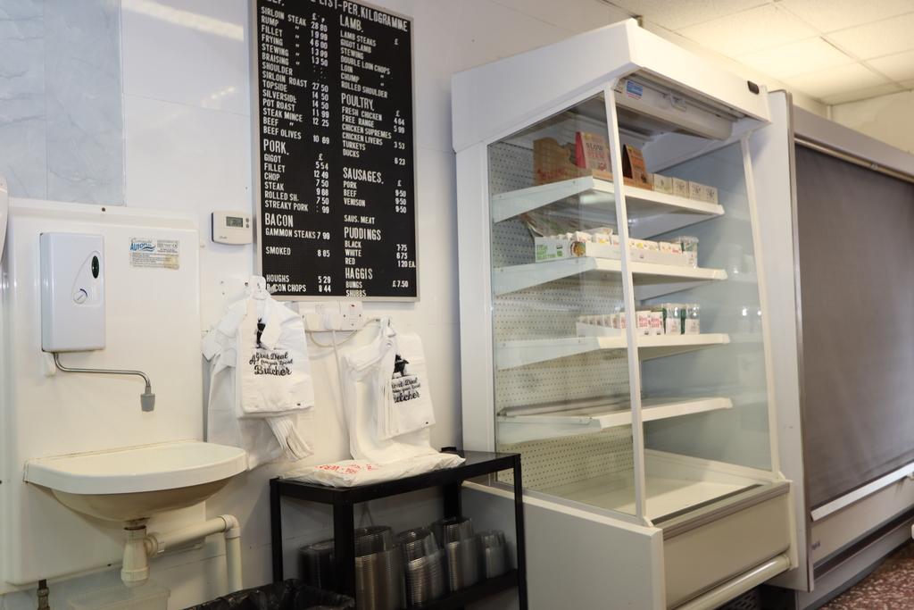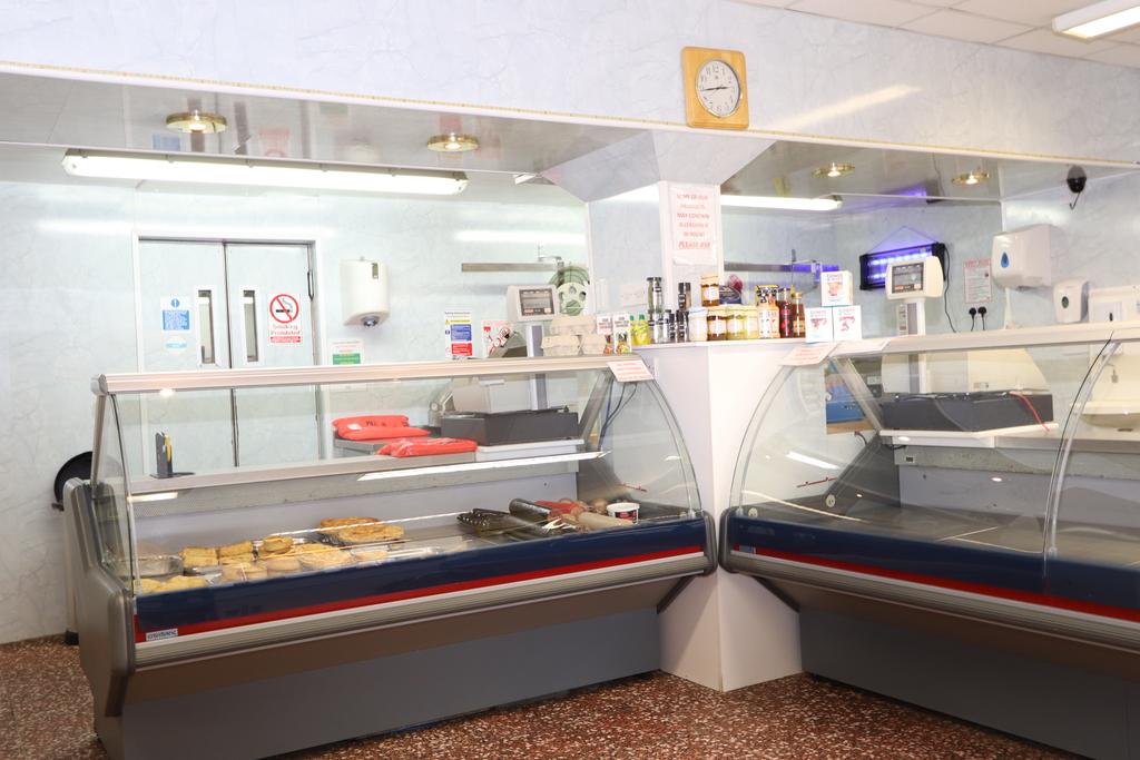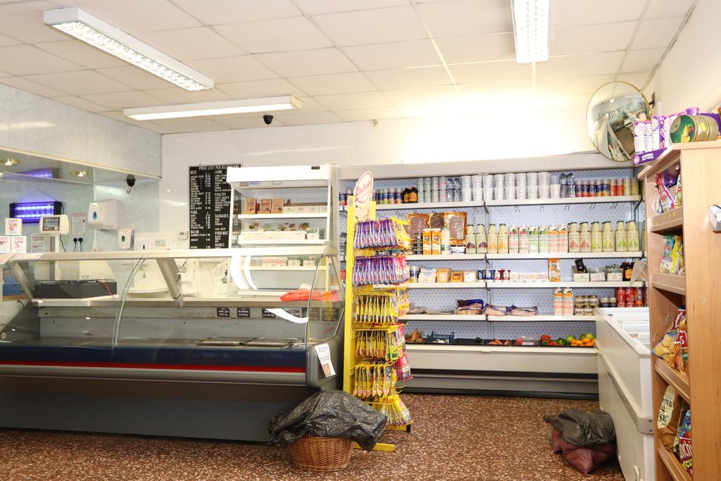 There is a large frontage facing onto the street with three large display windows and a UPVC entrance door. The large retail area has built-in fridges and sets of shelving. There are also two large freezers. There are two dairy cabinets and two serve-over counters. There are two slicers and a vacuum packer set on the stainless-steel stands. There is a small sink to the wall. The flooring is laid to tiles and there are strip-lights to the ceiling. A door leads into the office area and another door leads into the working room to the rear.