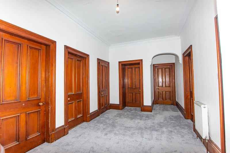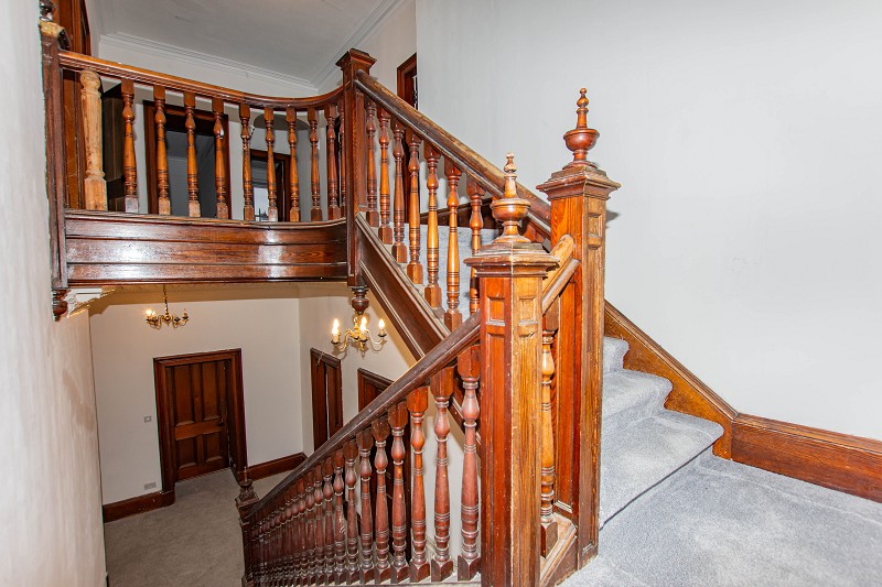 The beautiful original curved staircase is laid to carpet; at the midpoint there is a stunning stain glass window that faces the rear elevation. Doors lead to the bathroom, five bedrooms and a storage cupboard. Grey carpet has been laid to the landing and there is also a central heating radiator and a feature arch.