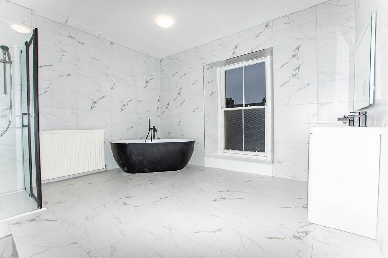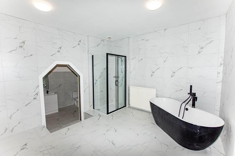 The stunning bathroom is set over multiple levels. As you enter a WC can be found and two sinks with mixer taps built into a high gloss vanity unit, above a large modern mirror can be found. There is a central heating radiator and a flush light fitting. A window, with storage below, can be found to the side elevation. Marble effect steps lead to the second elevation of the bathroom, to the left is a large, modern mains shower which has mosaic effect wet-wall. The bathroom also benefits from a large stand-alone bath and a feature archway. There is a second window to the rear elevation, an extractor fan and two flush light fittings.