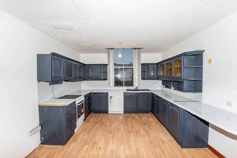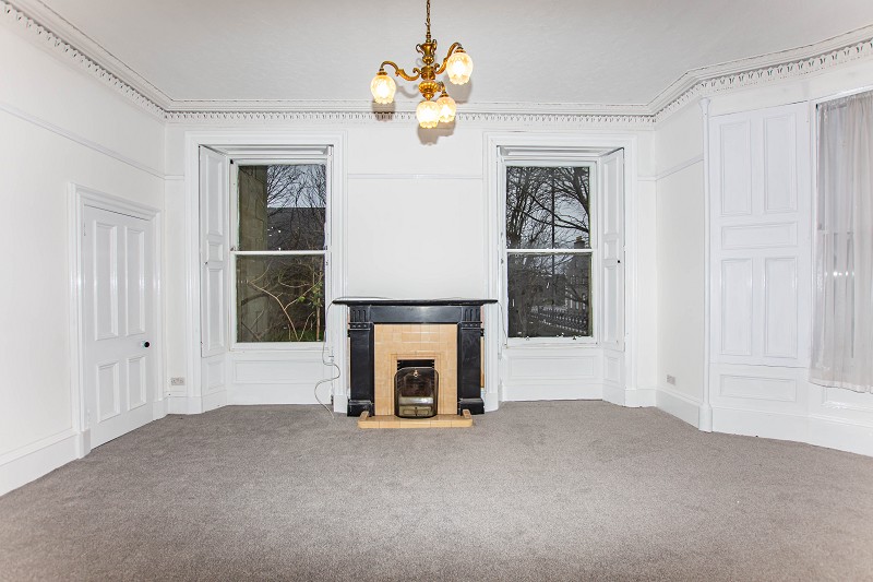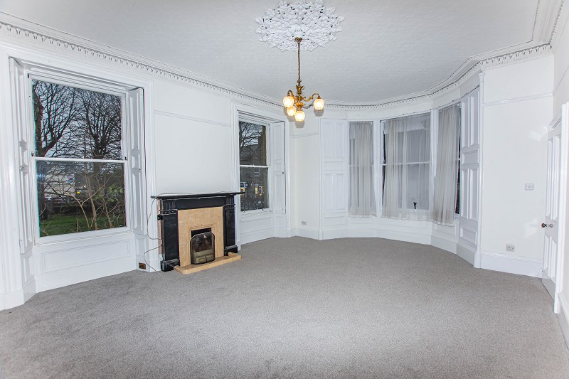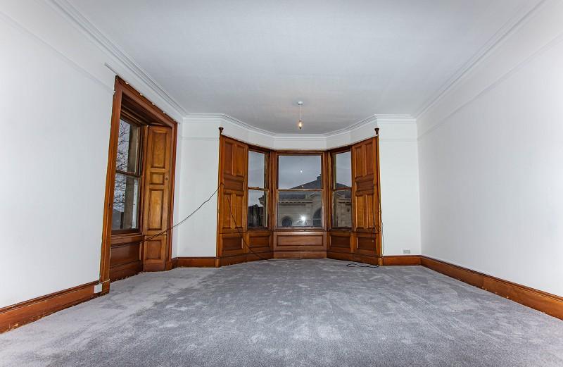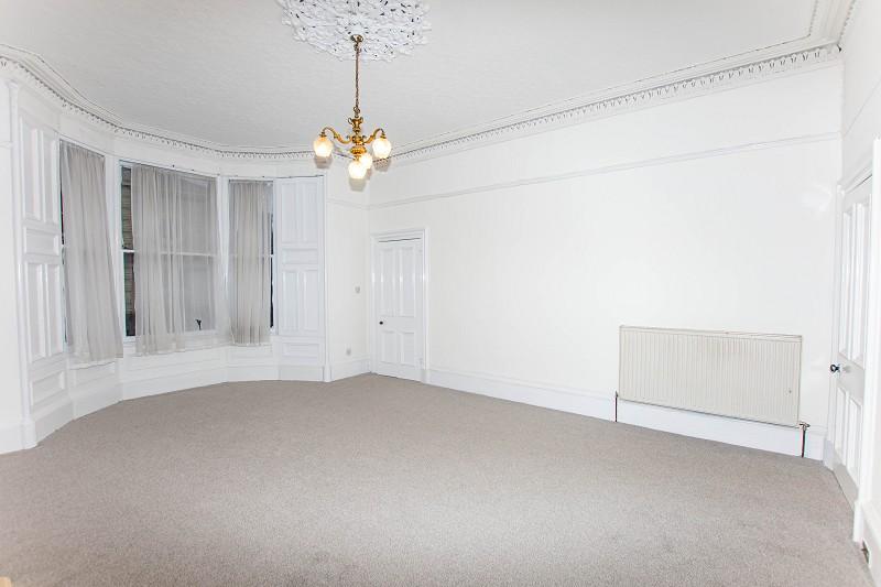 Stunning original coving, a picture rail and five-light chandelier with ceiling rose are a beautiful feature in this room. The walls are painted white and a grey carpet is laid to the floor. There are ample power points within this room as well as an electric fire with Caithness flag hearth. Three large bay windows are situated to the side elevation.