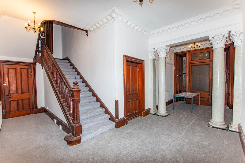 This exceptionally stunning hall benefits from the original ornate coving. There are four impressive marble effect pillars with ornate original features. Above, three five-light chandeliers can be found. The walls have been painted white with original wood deep skirtings. There are two central heating radiators and ample power points. Traditional wooden doors lead to the reception rooms, kitchen and the rear access door. An impressive staircase leads up to the first floor and there are large dual aspect windows to the front elevation.