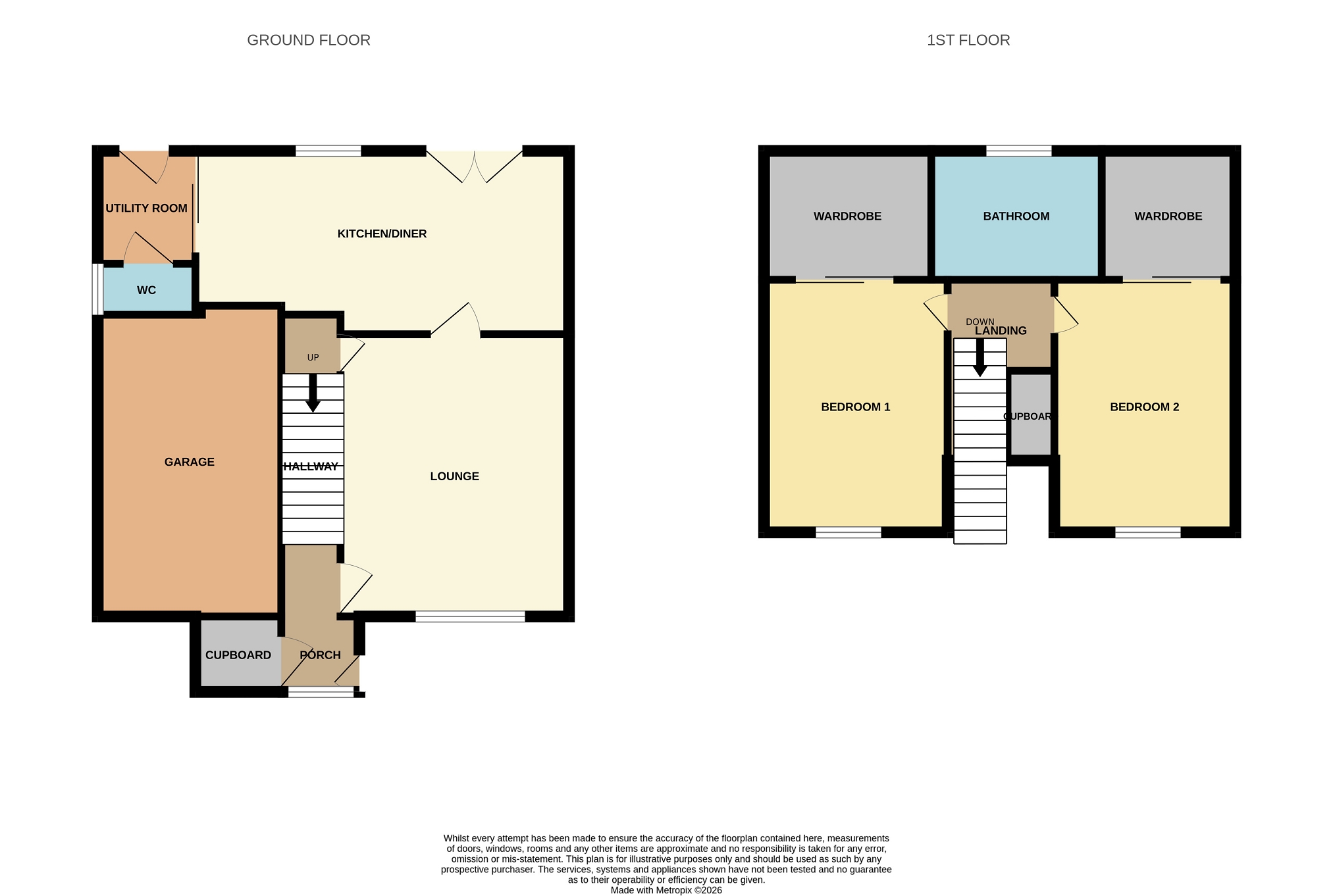 The property is entered via a bright inner hall with useful storage, leading into a spacious lounge with a large picture window to the front elevation. The well-appointed kitchen is fitted with base and wall units, complementary worktops, integrated oven and hob, and provides ample space for dining. From here, there is direct access to the rear garden as well as a separate utility room with additional storage and external door. A conveniently located WC completes the ground floor accommodation.