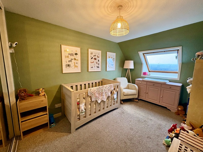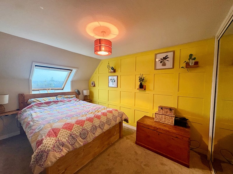 This beautiful room has a feature panel wall and a beige fitted carpet. Mirrored built in wardrobes provide storage. There is a pendant light fitting, a central heating radiator and a velux window faces the front elevation.