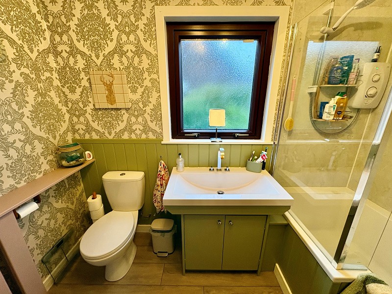 This stylish room benefits from a bath with shower above. There is a WC and the basin has been built into a vanity unit. Laminate has been laid to the floor. There is a triple light fitting and a window faces the front elevation. There is also a central heating radiator.