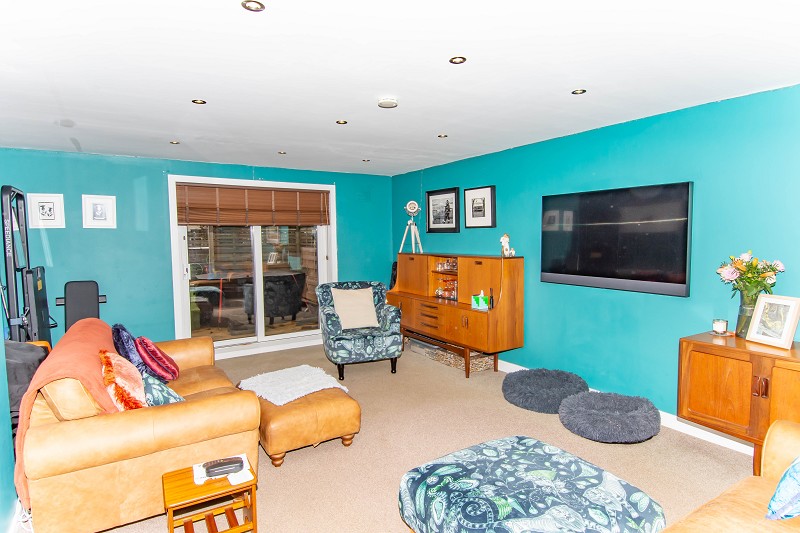 The beautiful lounge has been tastefully decorated. There are ceiling downlighters, two central heating radiators and double sockets. A beige carpet has been laid to the floor. Patio doors give access to the decking area of the back garden and awindow, fitted with blinds can be found to the front elevation. This is a spacious and bright reception room.