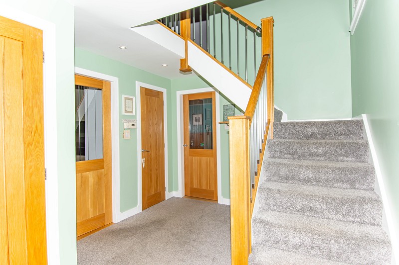 Accessed via a composite door, the inner hall is well presented with painted walls and a grey fitted carpet. There is a chrome central heating radiator and deep oak