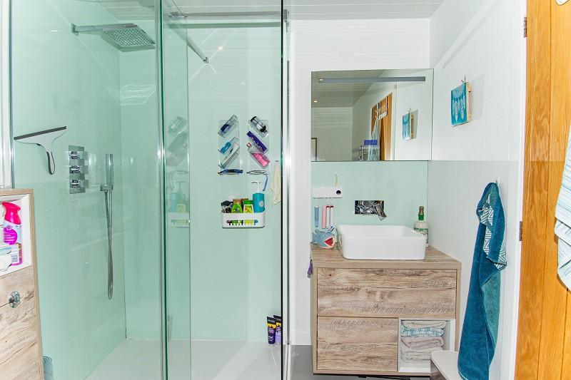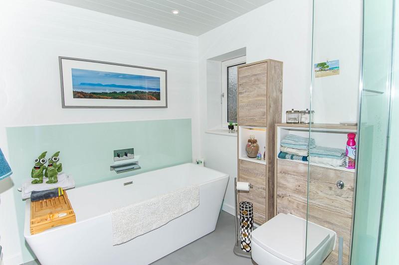 This fabulous room benefits from a double shower enclosure with dual attachments as well as a freestanding bath. The washbasin and the W.C have both been built into a vanity unit. There is a wall mounted storage cupboard, LTV flooring as well as an illuminated mirror. Above the washbasin is a wall mounted toothbrush holder, there are ceiling downlighters and a chrome towel ladder radiator. An opaque window faces the rear elevation.