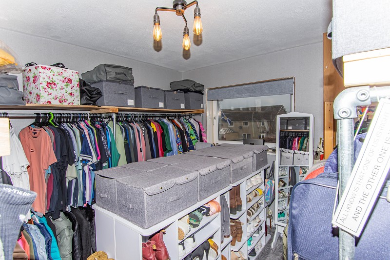 Tastefully decorated throughout, this room is currently used as a dressing-room. There are hanging rails to three walls as well as shelving. A carpet has been laid to the floor and there is also an industrial drop-down light fitting. This room houses the central heating boiler and has a window, fitted with a roller blind to the rear.