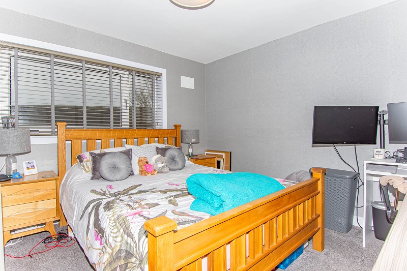 This beautiful room has been wallpapered throughout and benefits from a grey fitted carpet. There is a flush light fitting, a central heating radiator and double sockets. A window, fitted with blinds faces the front elevation.