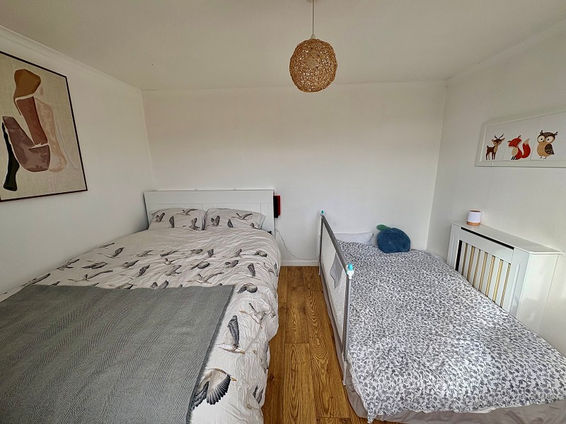 The L-shaped bedroom benefits from a deep storage cupboard. The walls have been painted, there is a pendant light fitting, central heating radiator and double sockets. A window faces the rear elevation.