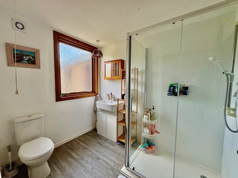The generous shower room benefits from a deep walk-in shower as well as a WC. The basin has been built in to a vanity unit and there is also an extra storage cupboard. LTV has been laid to the floor, there is a wall mounted cupboard and a shaving point. An opaque window faces the rear elevation.