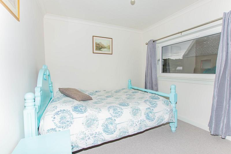 This bright room has white painted walls and a beige carpet. The room also benefits from coving and a good size window which faces the rear elevation. There is a pendant light fitting and electrical sockets. Storage can be found behind two full length grey curtains.