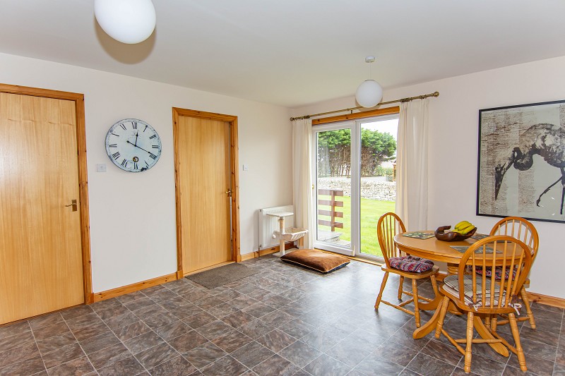 The attractive kitchen is well presented and benefits from a window, fitted with a blind, to the side elevation and sliding patio doors to the rear. There is an excellent selection of oak wall and base units with laminate worktops. Between the units have been tiled. The kitchen benefits from a ceramic hob, a fridge-freezer, single oven and two central heating radiators. Space can be found for a table and chairs. This room has two pendant light fittings and vinyl flooring. A door gives access to the utility room.