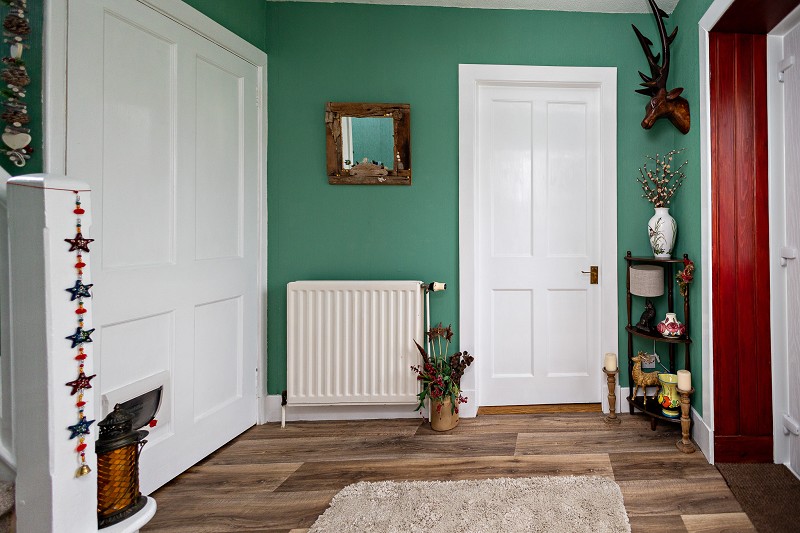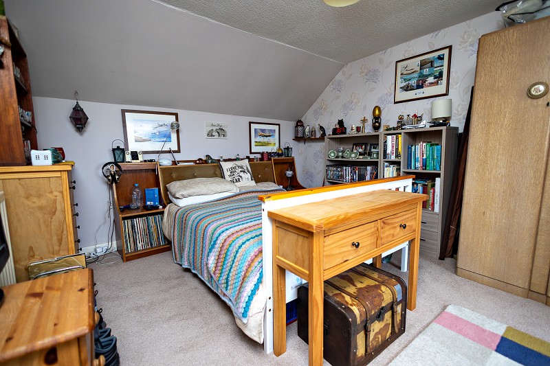 This lovely room has a red painted feature wall with an attractive exposed stone decorative fireplace with Caithness stone hearth and wooden mantle. Although this fire place is currently closed off, it could easily be reinstated into a functional fireplace. A window with countryside views looks out to the front of the home and provides plenty of natural light. A high-level shelf runs along one wall and the room benefits from a carpet, pendant light fitting and a radiator.