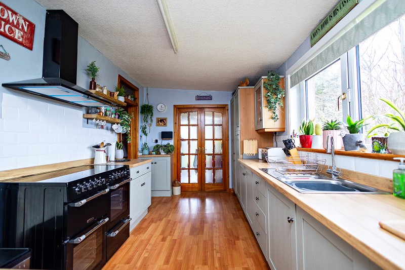 This room has beautiful, newly fitted wall and base units with fitted worktops, the units are a lovely light sage colour which contrasts with the wood effect worktops and white metro tile splashbacks. The kitchen benefits from a large Cookmaster cooker with five rings, double ovens and a hot plate, an integral fridge/freezer and a one and a half bowl stainless-steel sink with mixer tap. There is wood effect laminate flooring, a radiator and a strip light fitting. The rear facing window looks out over the garden. Ten-pane double doors open into the sun room and a fifteen-pane door opens into the rear hall.