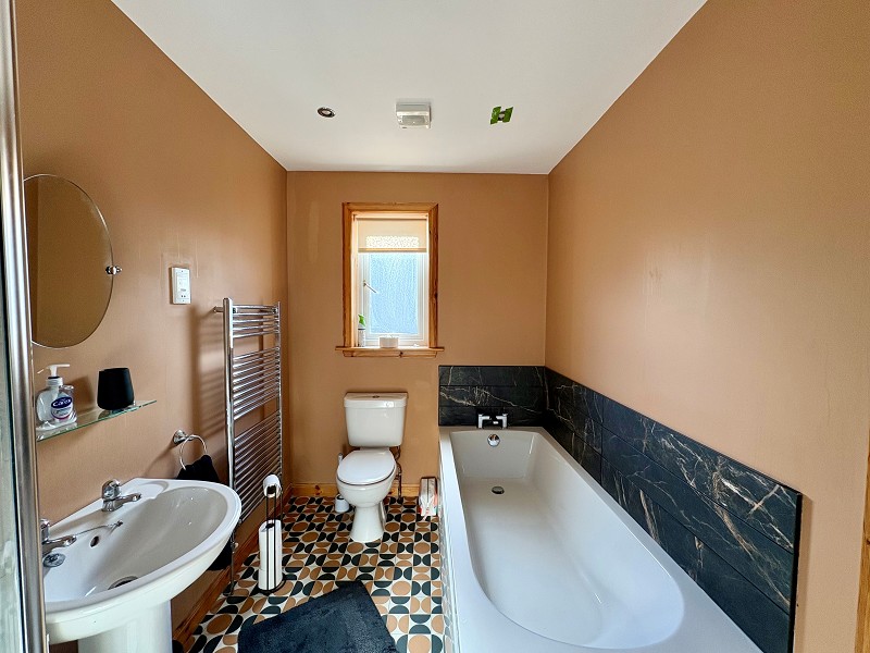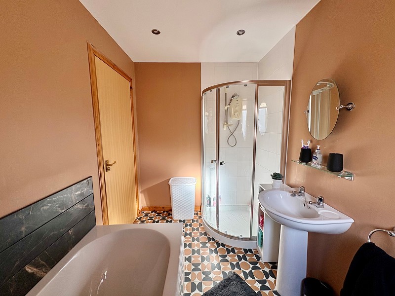 This stylish room boasts a shower enclosure as well as a bath which has tiling above. There is a WC and pedestal basin. Vinyl has been laid to the floor. There is a chrome towel ladder radiator, a wall mounted mirror and an extractor fan. An opaque window faces the side elevation. This well-presented room also benefits from ceiling downlighters.