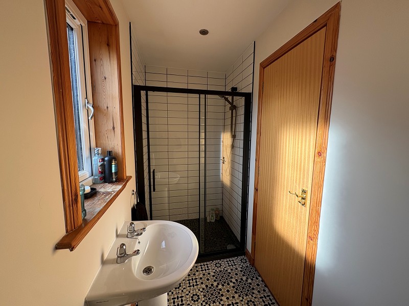 The shower room is bright and benefits from a black recessed shower enclosure. There is a pedestal basin, WC and vinyl has been fitted to the floor. This room benefits from a chrome towel ladder radiator and ceiling downlighters. An opaque window faces the side elevation.