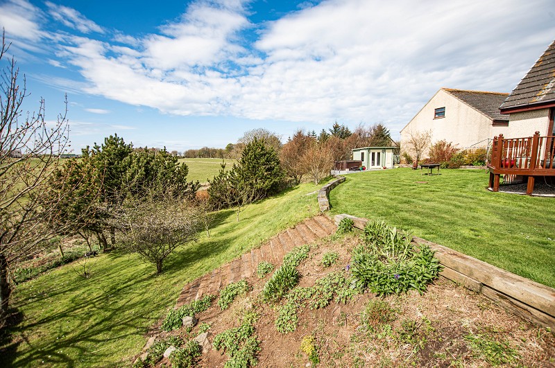 This property is accessed by a private gravel drive and a dry-stone dyke wall. The driveway is extensive with parking for multiple vehicles. A gate gives access to the tiered rear garden which is mainly laid to lawn with flower borders and a summer house. A raised decking area is ideal to sit in and entertain during the summer months and enjoys scenic rural views. The rear garden also features railway sleepers, Caithness flagstones and a dry-stone dyke wall. Steps lead down to the woodlands where there are birch, fir and other varieties of mature trees. The property also comes with a large paddock of good grazing which is ideal for equestrian enthusiasts. Within the field is a steel shed which was used as a field shelter for ponies. There is also a patio area to the front of the house which has a south facing garden.