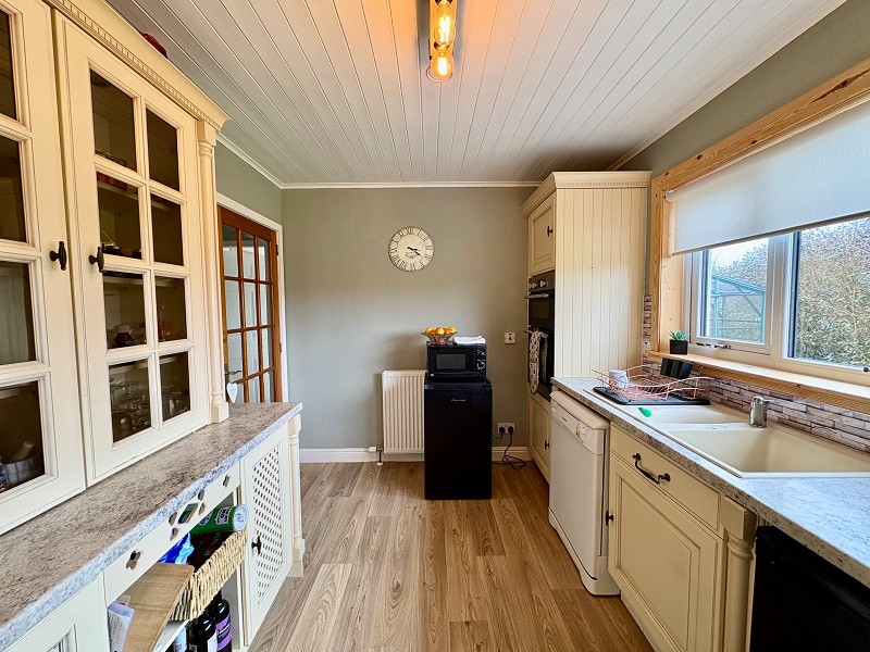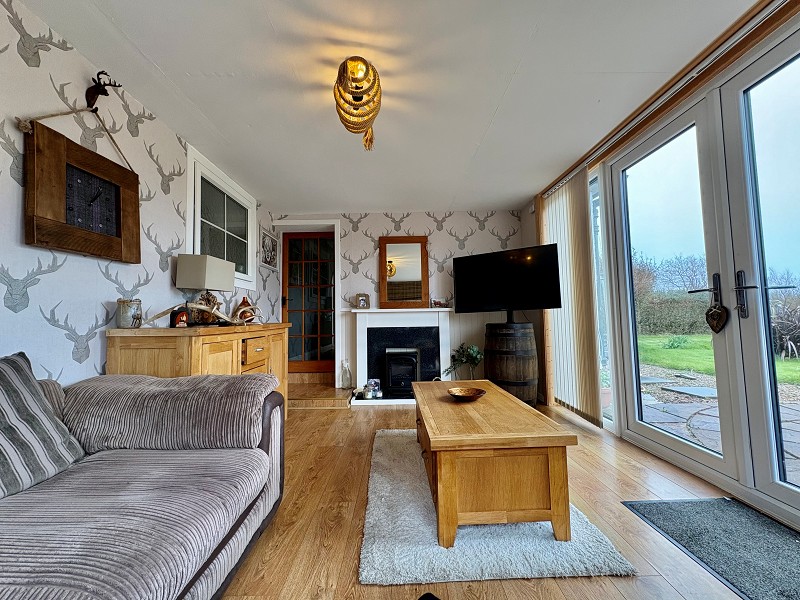Ideally located to take in the scenic views, this tastefully decorated room has been wall papered and also benefits from wood-panelling. Oak laminate has been laid to the floor; there is a feature light fitting and double-glazed doors lead out to the rear garden. A focal point within the room is the white painted fireplace with a cosy electric fire. There are dual aspect windows with blinds and double sockets.