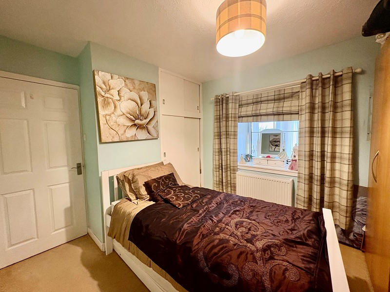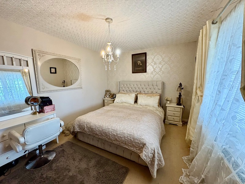 This stylish room is beautifully presented and benefits from a drop-down light chandelier. There is a feature papered wall as well as a beige fitted carpet. A built-in wardrobe provides storage; there are also power points as well as a central heating radiator. A window with blinds faces the front elevation.